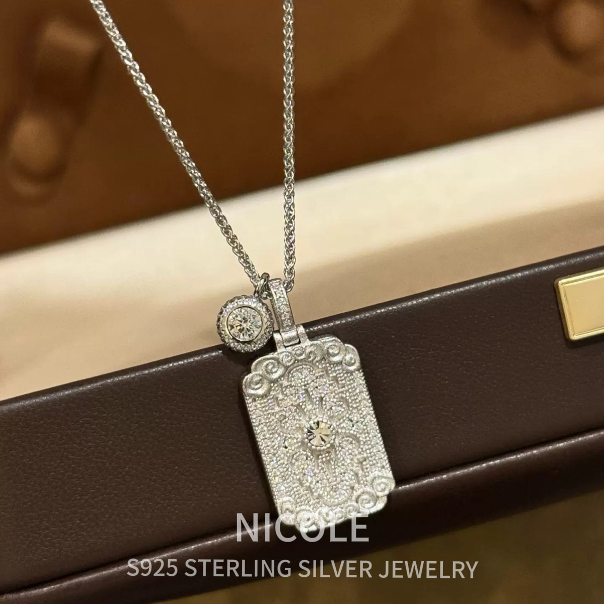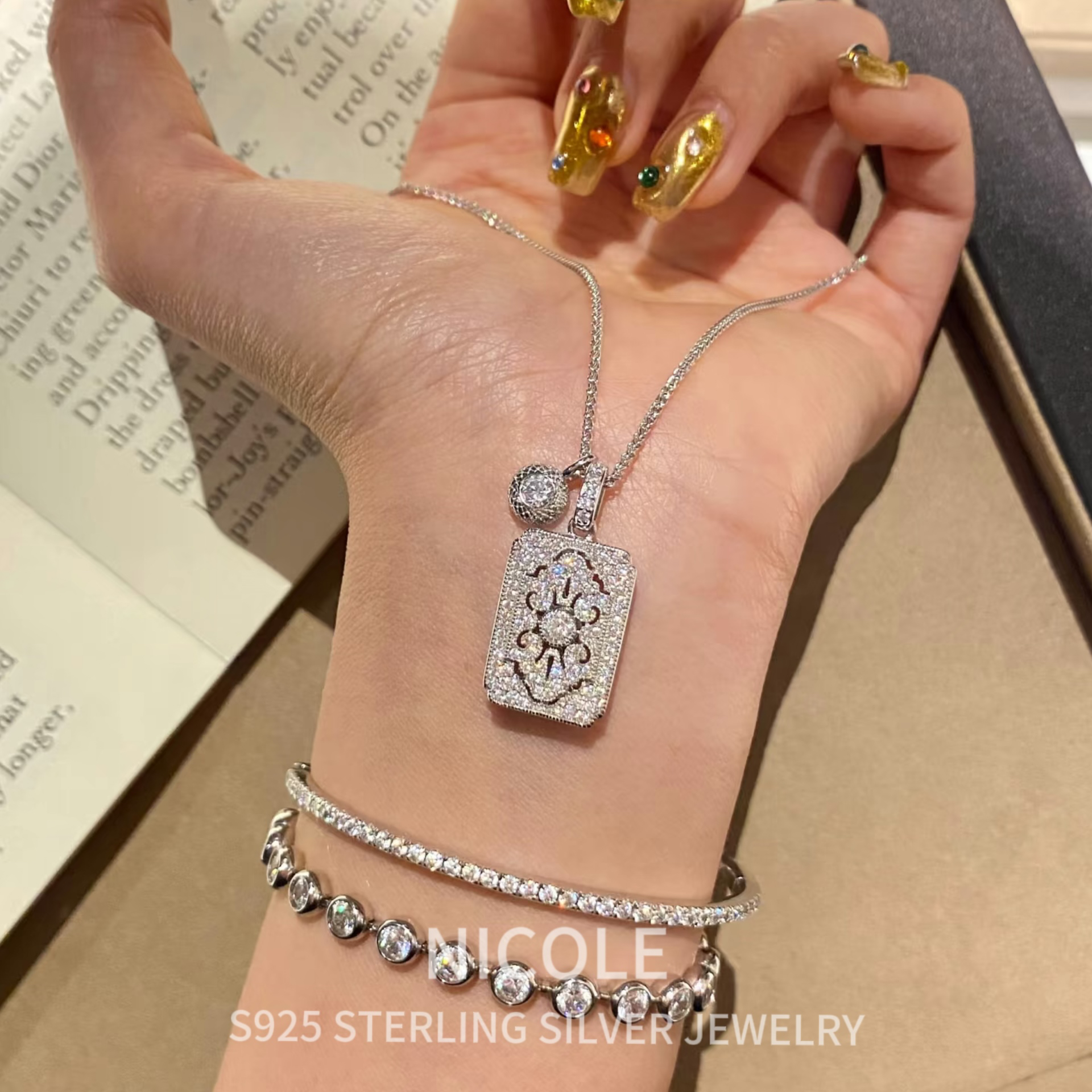 Nicole S925纯银满钻蕾丝雕花无事牌项链镂空小方牌锁骨链轻奢