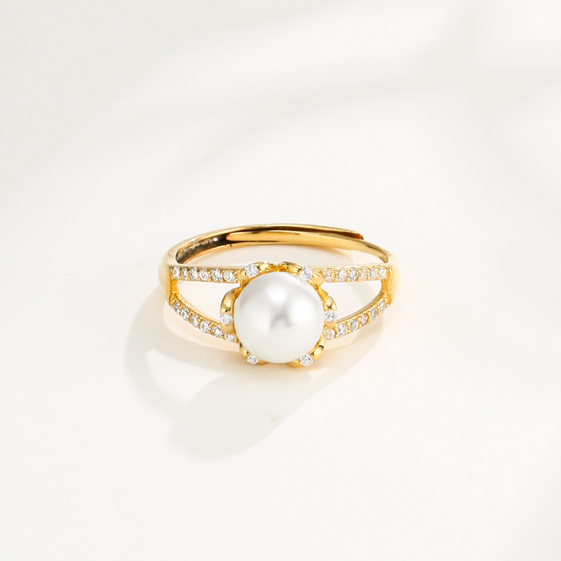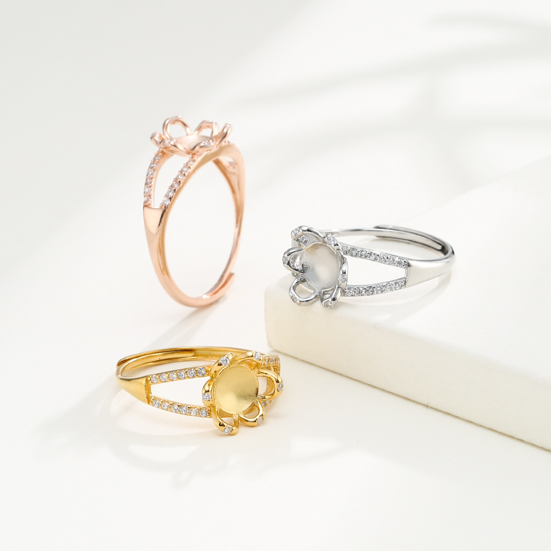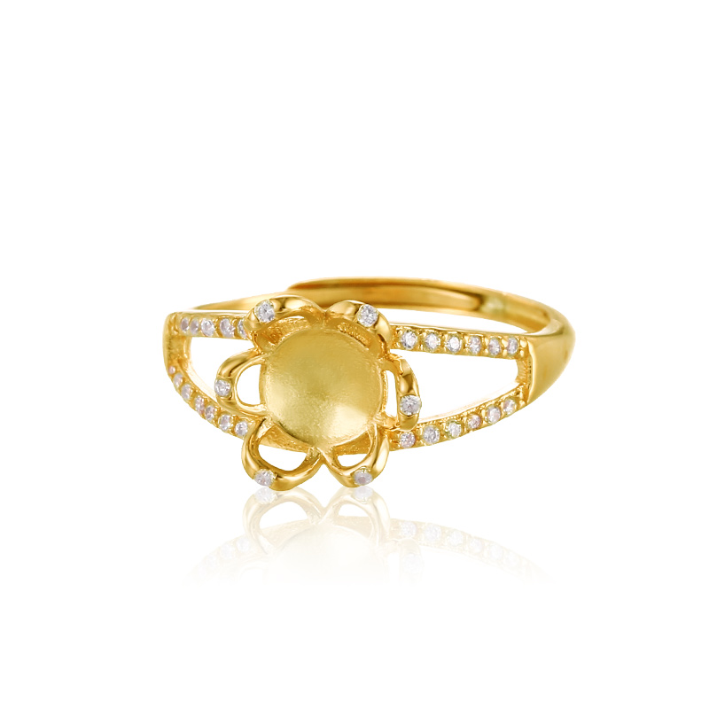 DIY珍珠配件 S925银珍珠戒指空托 时尚金色银色指环托配6-8mm圆珠