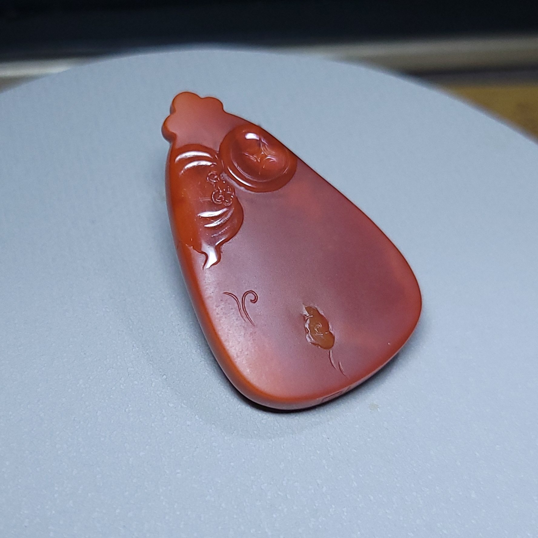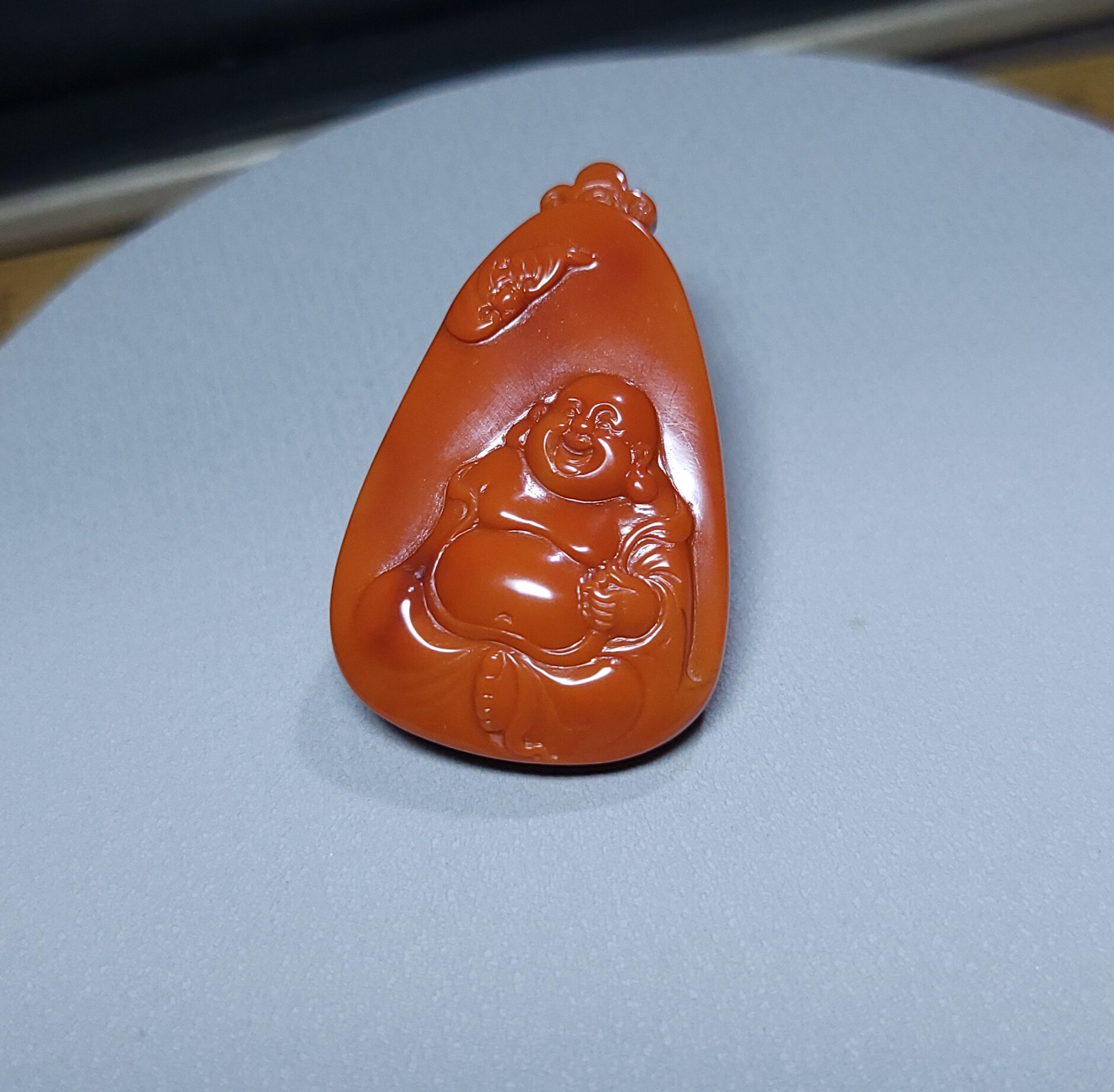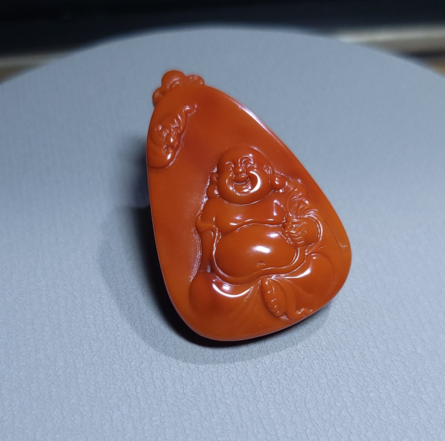 新疆的猫Z122004 9.1克,细密油亮玉质浑厚极浓艳锦红色南红佛牌