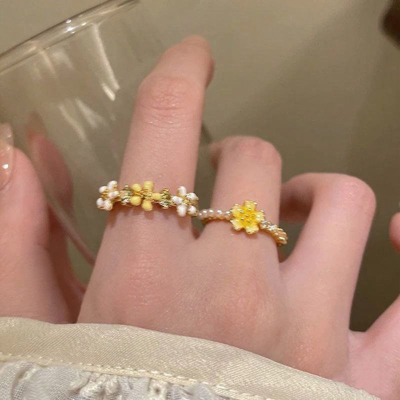 2025新款黄色雏菊锆石珍珠戒指女小众设计可爱甜美食指戒配饰指环