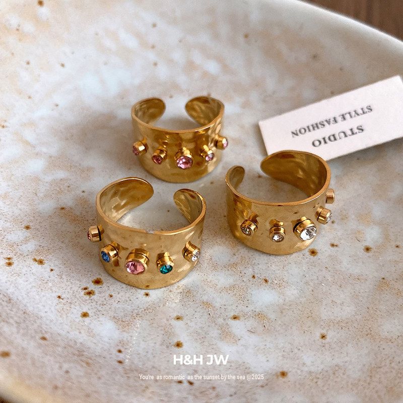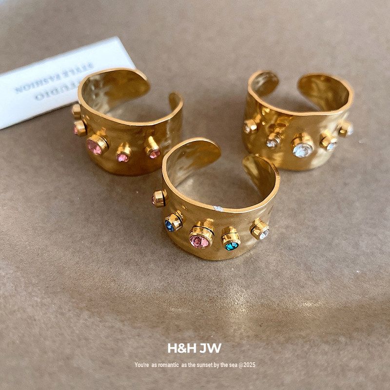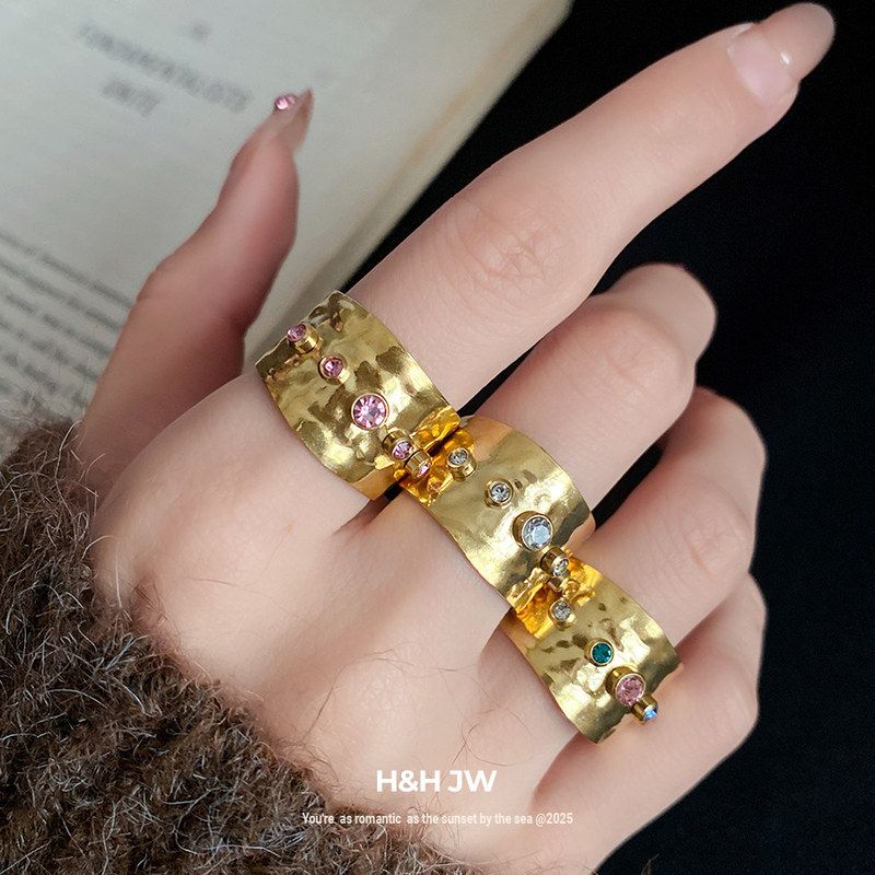 圆形手饰时尚不锈钢女褶皱开口戒轻奢气质戒指欧美高级感食指镶钻