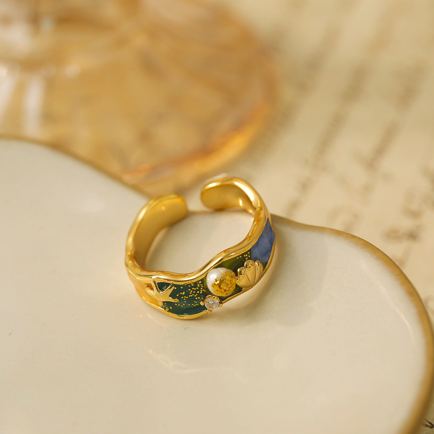 精致文艺蓝色海洋海星贝壳戒指多巴胺彩色滴釉高级感开口小戒指女