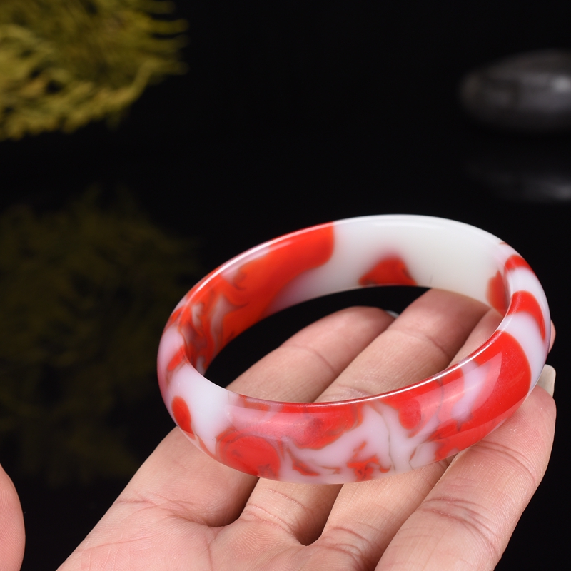 新疆和田玉鸡血玉手镯飘花金丝玉红白色玉镯加宽版正圆镯子女款