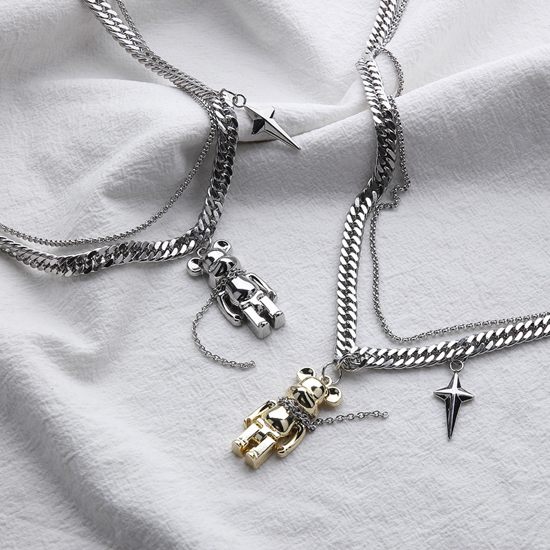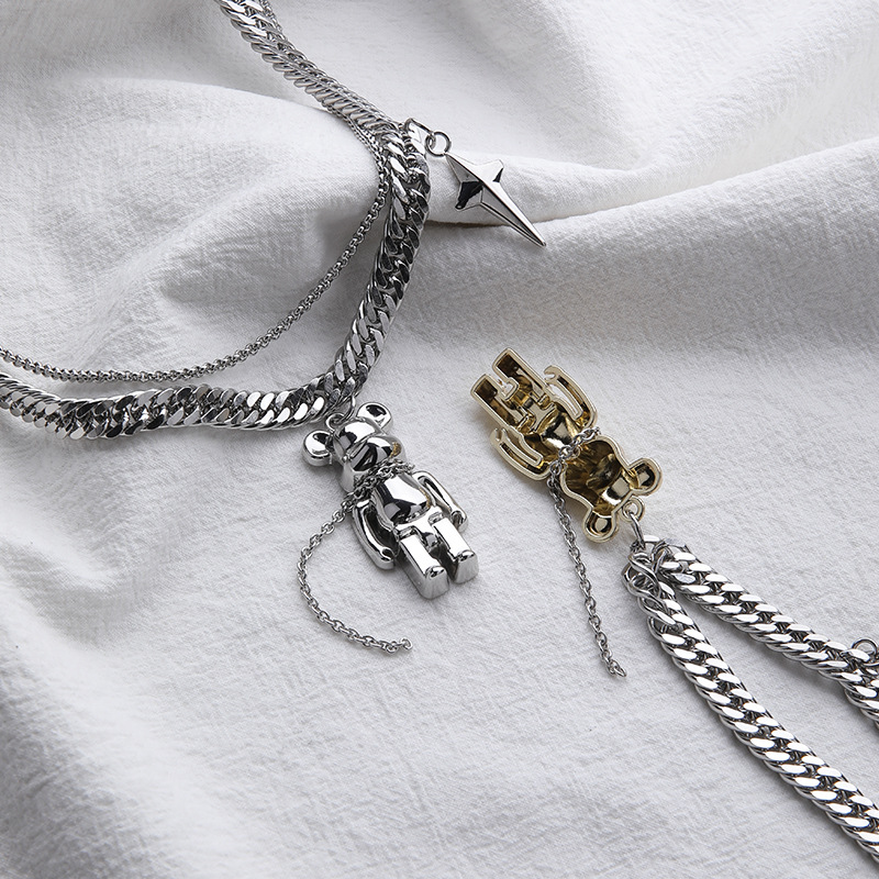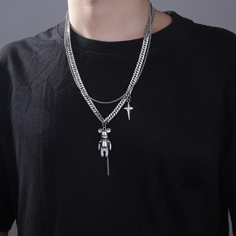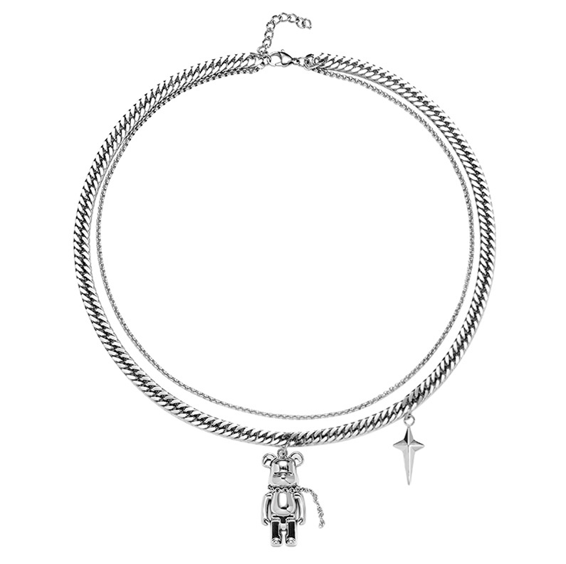 双层银色暴力小熊钛钢不掉色小众设计女高级感嘻哈情侣项链男潮