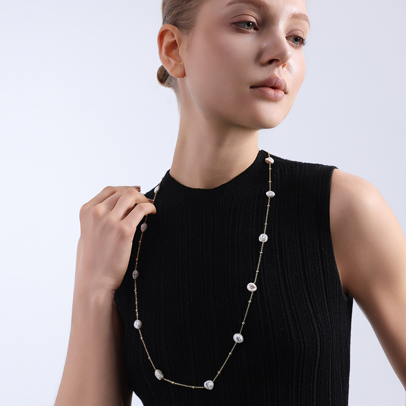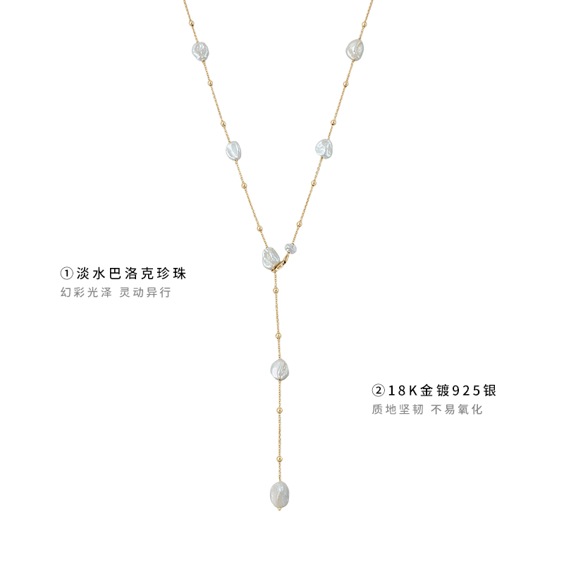 TRK珠宝满天星淡水极光巴洛克珍珠长项链女银镀18K金轻奢毛衣链女