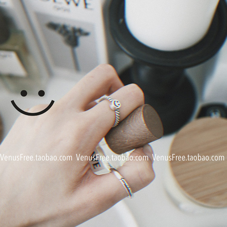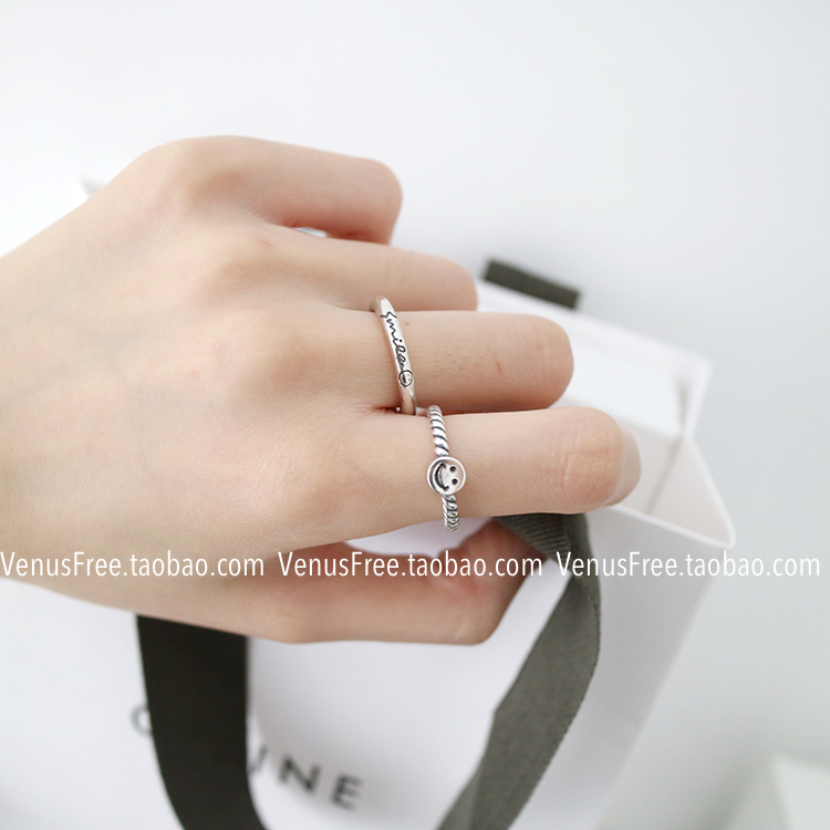 VF定制 韩国ins幸运笑脸Lucky925纯银戒指麻花smile光面加粗指环