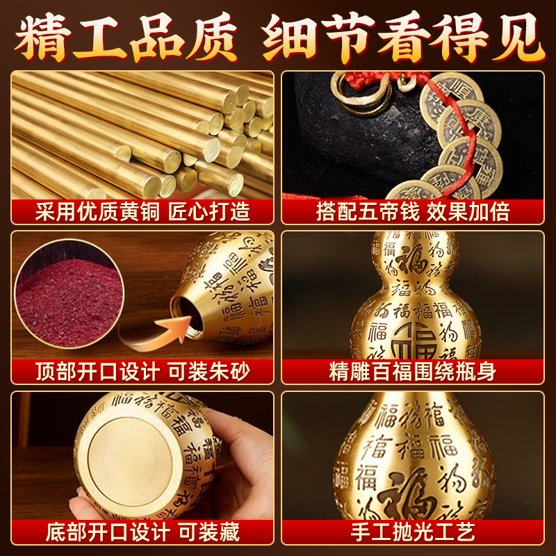 纯黄铜百福葫芦摆件开口葫芦家用玄关客厅办公室五帝钱吉祥结挂件
