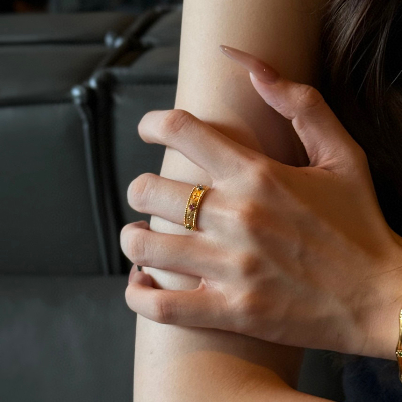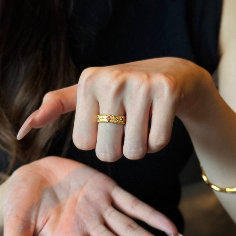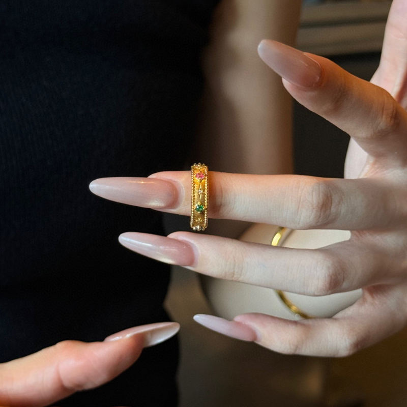 5D硬金黄金星芒戒指女999足金点钻镶嵌彩宝指环新款食指戒送女友