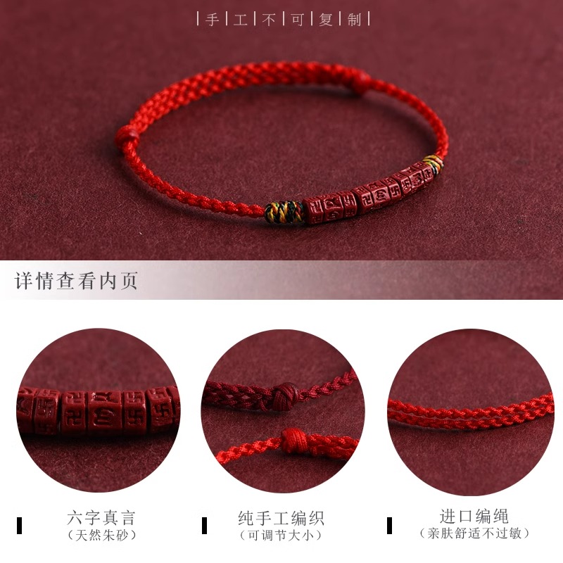 普陀山天然朱砂六字真言红绳手链脚链男女转运珠藏式五彩编织手绳