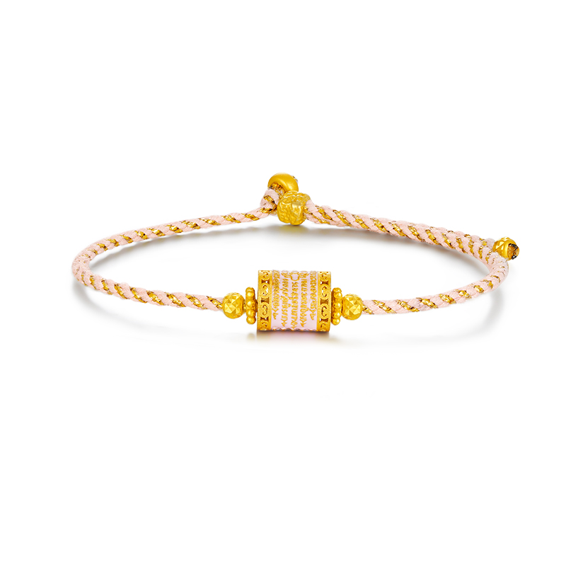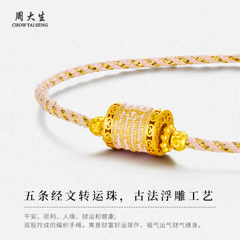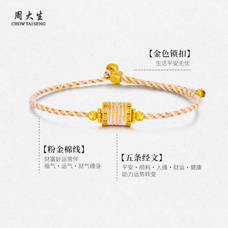 周大生官方S925五条经文粉金手绳女款转运珠手链手工编织绳