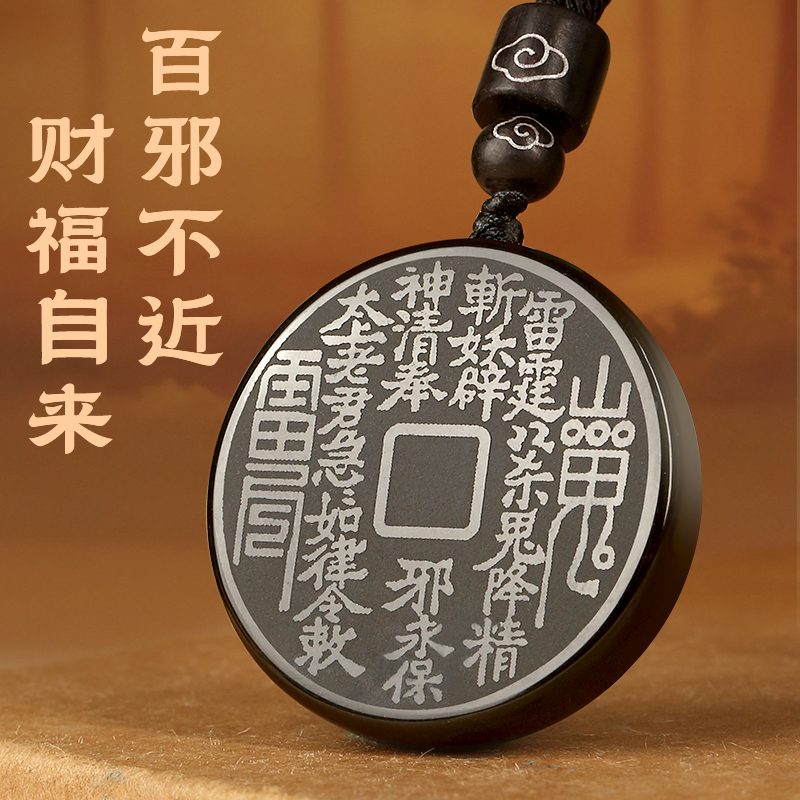 山鬼花钱官方旗舰店天然黑曜石山鬼花钱吊坠男女项链本命年钥匙扣