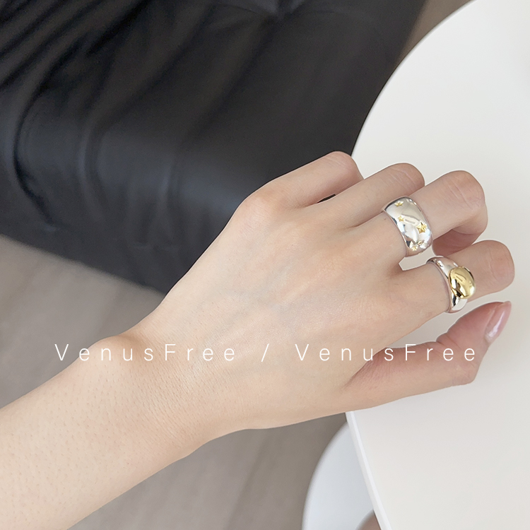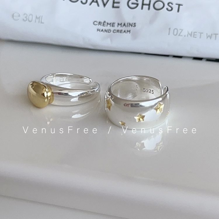 重工韩国925纯银加粗加厚纯银镀金小圆球星星宽光面戒指开口叠戴