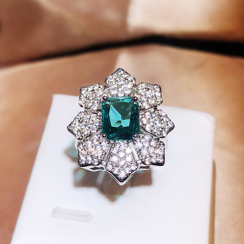 欧美高端珠宝女士高级气质花瓣硞石镶钻仿真绿色托帕石镀白金戒指