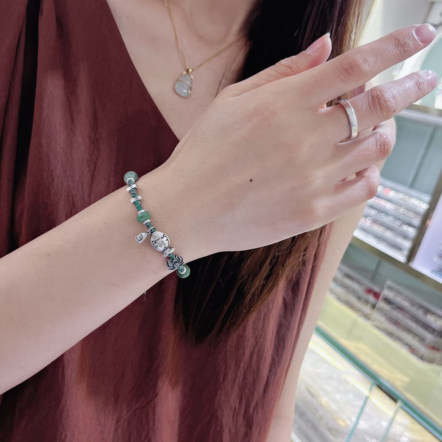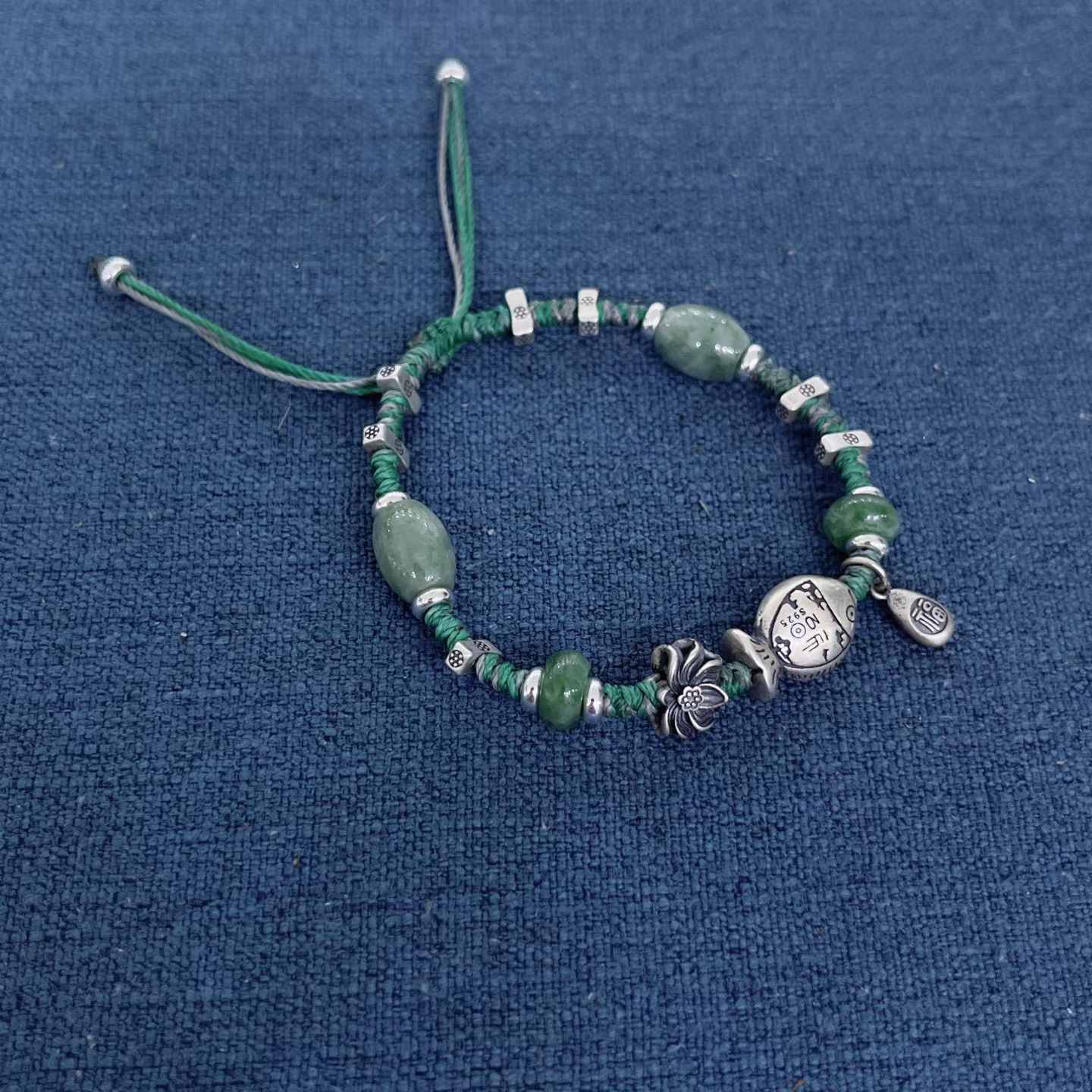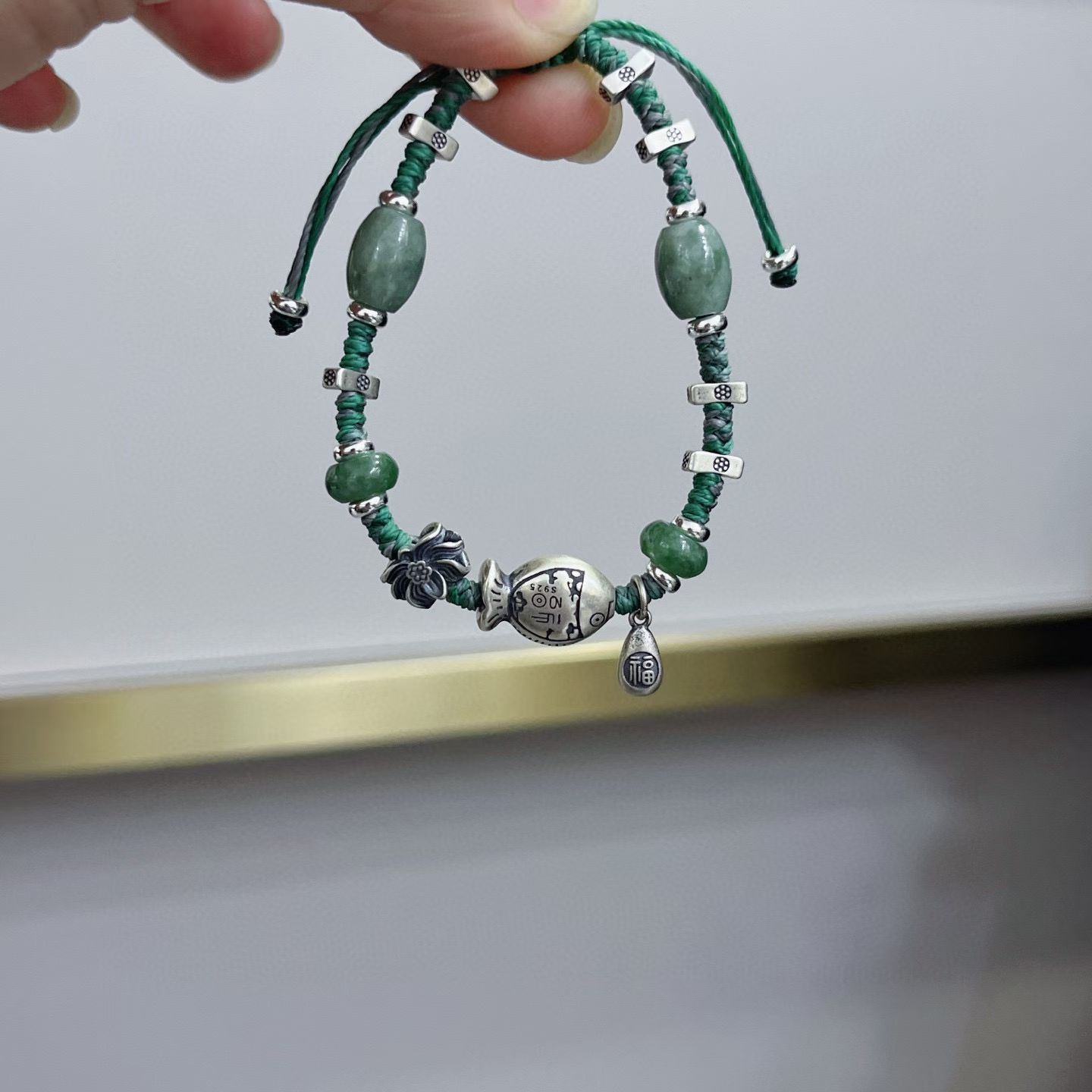天然复古古着翡翠编织手链女银饰花朵吊坠民族风手链小鱼和田玉