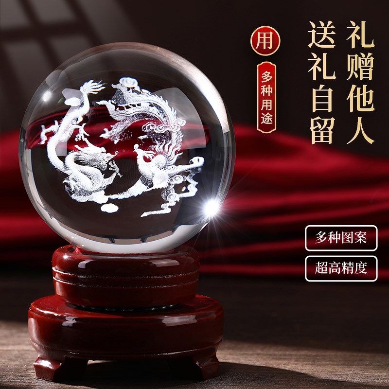 实用3D内雕定制龙凤呈祥白色水晶球桌面小摆件生十二生肖办乔迁礼