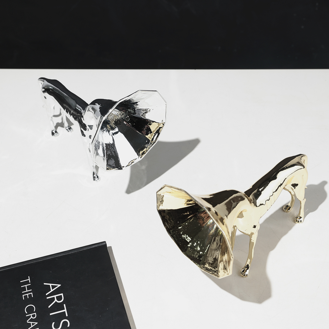 现代简约样板间设计师搭配金属喇叭狗客厅玄关柜抽象艺术桌面摆件