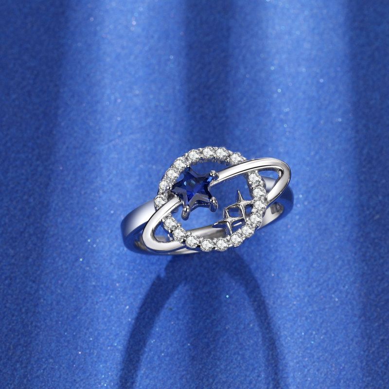 跨境欧美星球戒指女 韩版小清新蓝钻单排钻 五角星开口星球戒指女