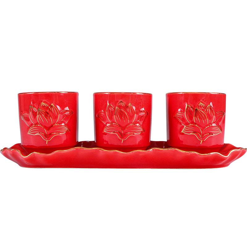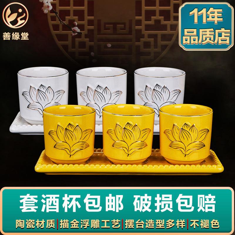 三连杯酒杯拜拜陶瓷五连杯财神爷莲花三摆台供杯酒壶家用摆件红色