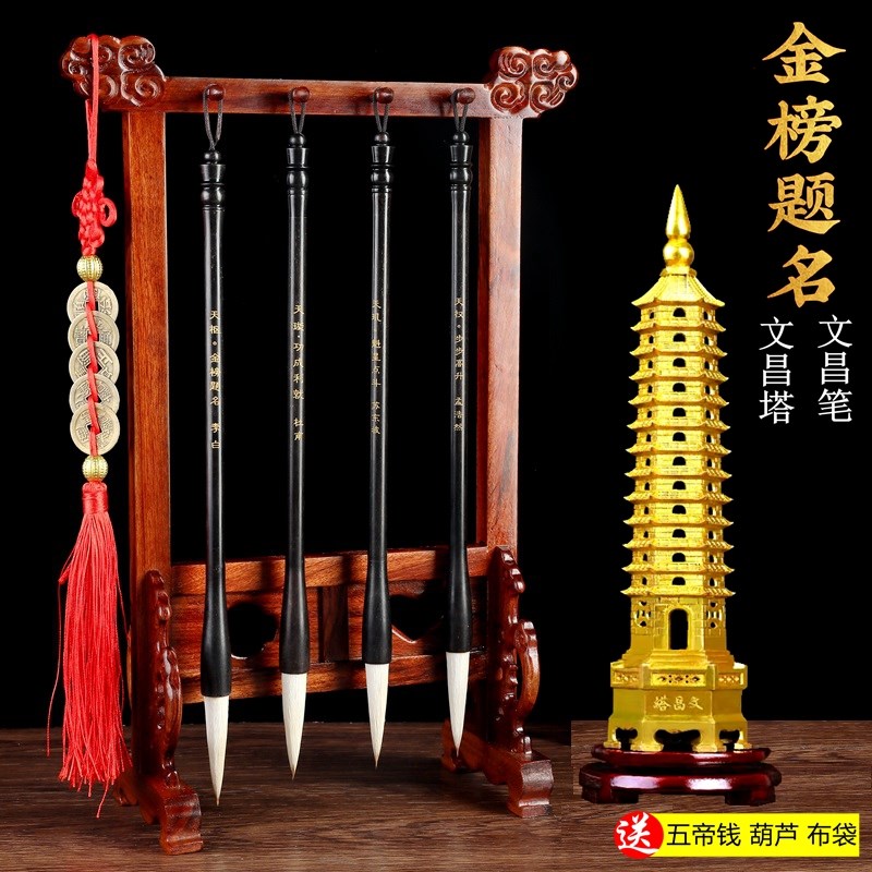 文昌毛笔套装实木笔架挂4支九层十三纯黄铜塔学生男女孩书桌摆件