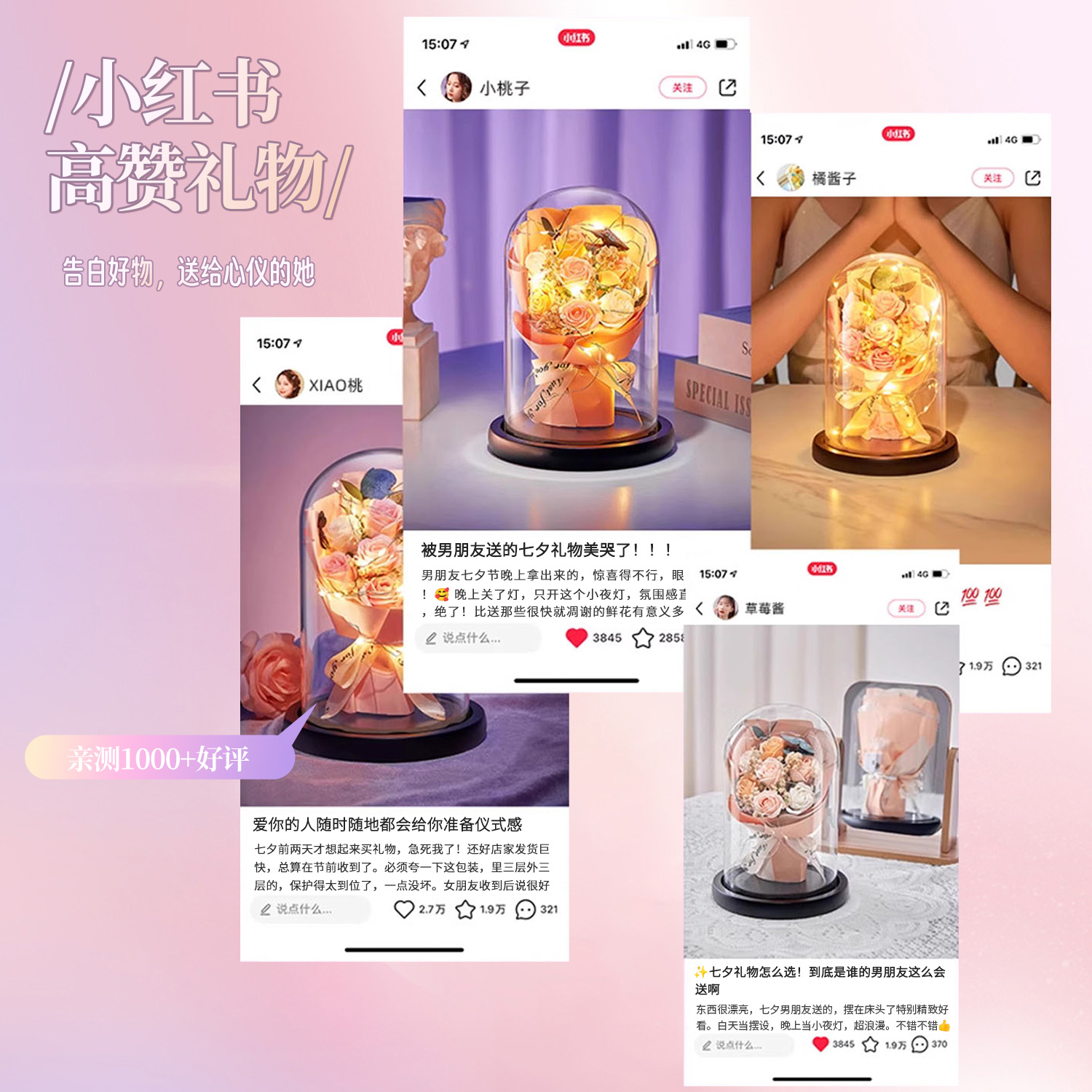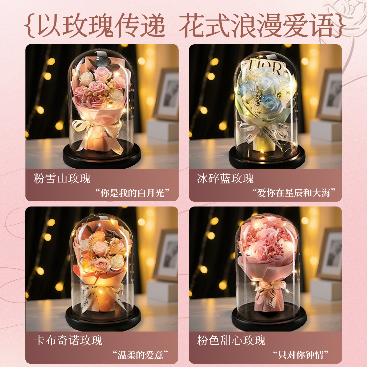 七夕玻璃罩玫瑰永生花束情人节创意礼品桌面装饰高级感摆件伴手礼