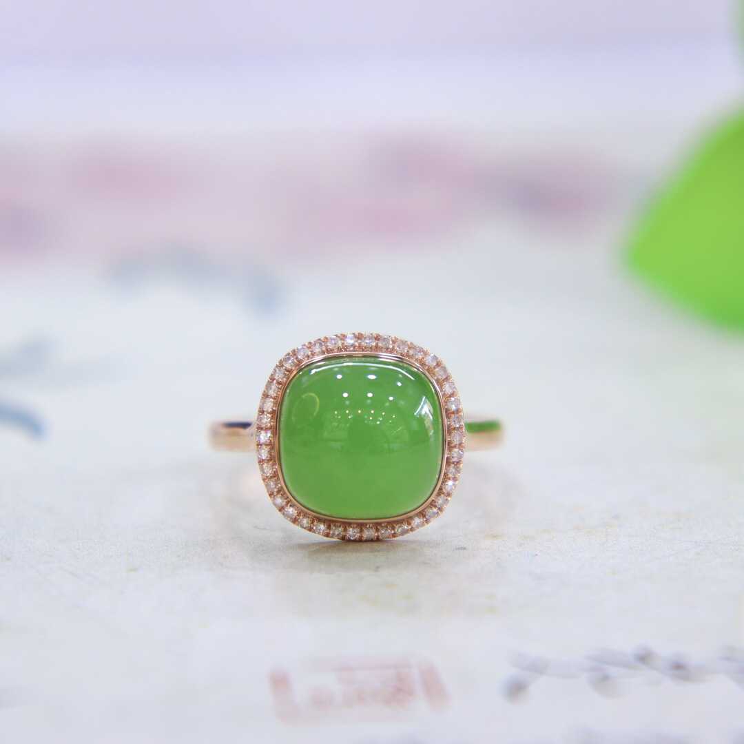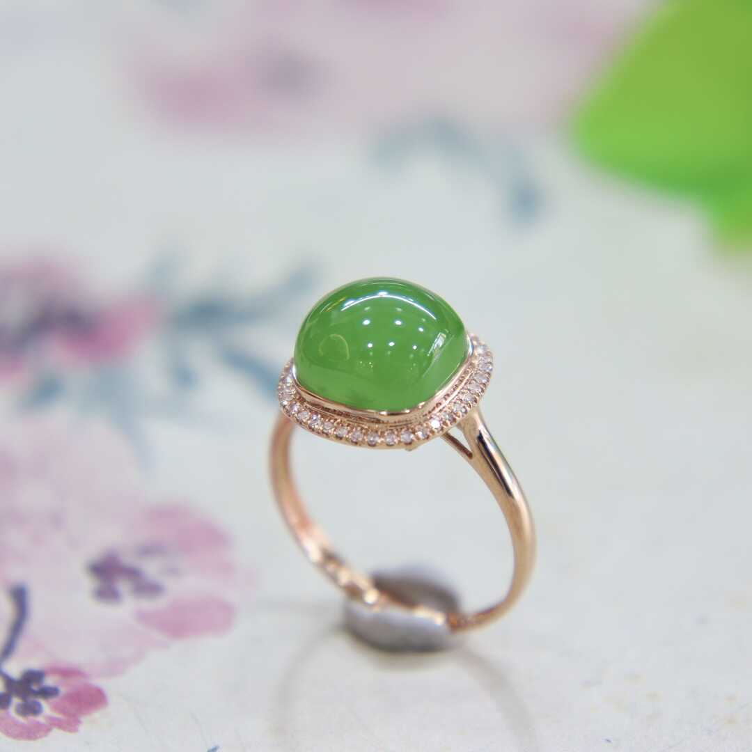 中秋礼品和田碧玉戒指女a苹果绿碧玉方面镶嵌18k金指环满钻送长辈