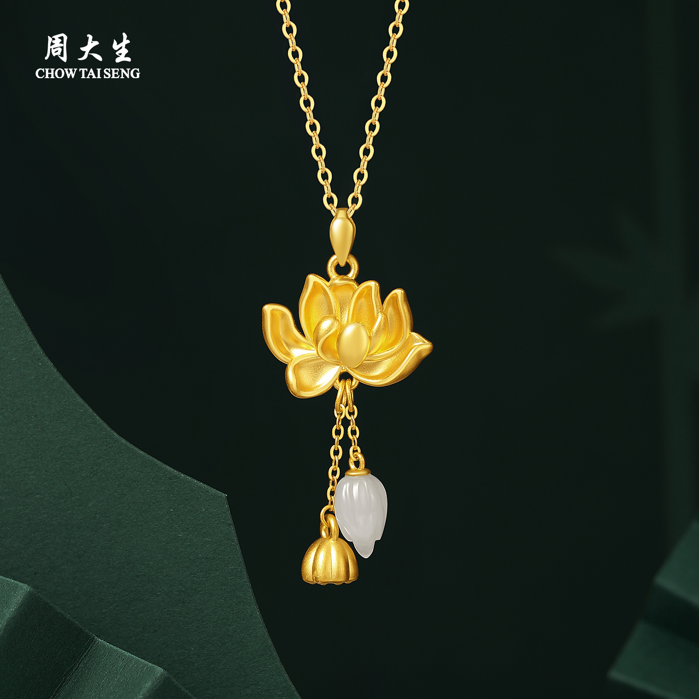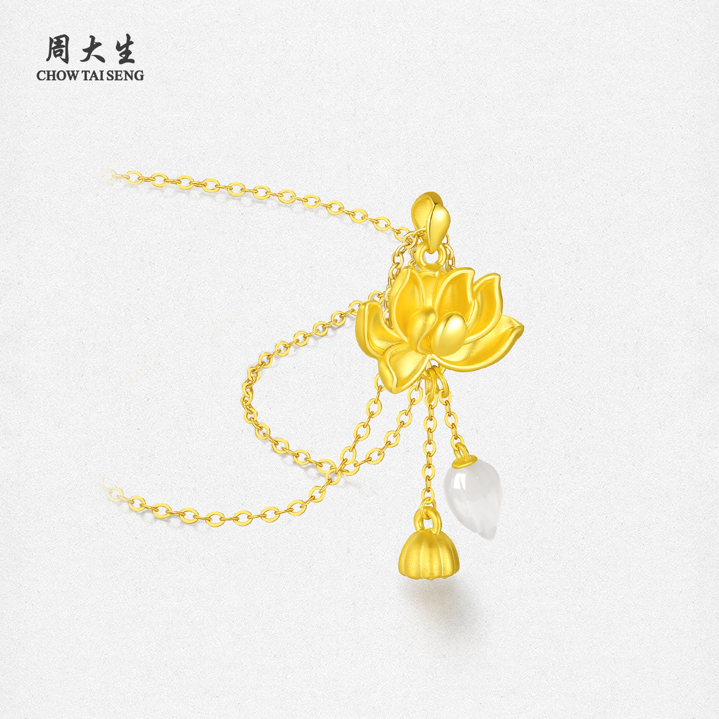 周大生黄金莲花吊坠和田玉两世欢莲蓬项链挂坠生日礼物送女朋友