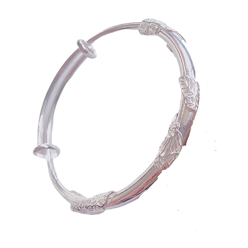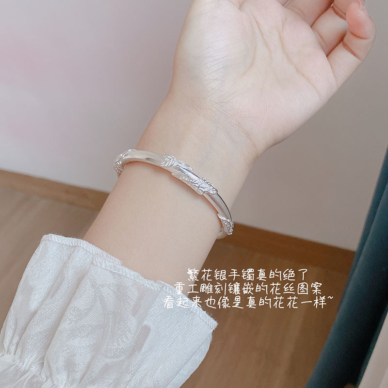 「繁花似锦」s9999足银手镯女高级感重工实心纯银镯子推拉可调节