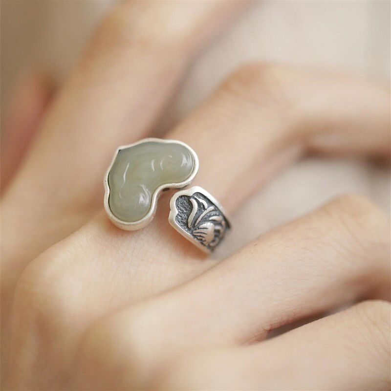 925银新中式复古做旧民族风y和田玉如意戒指环开口调节简约高级感