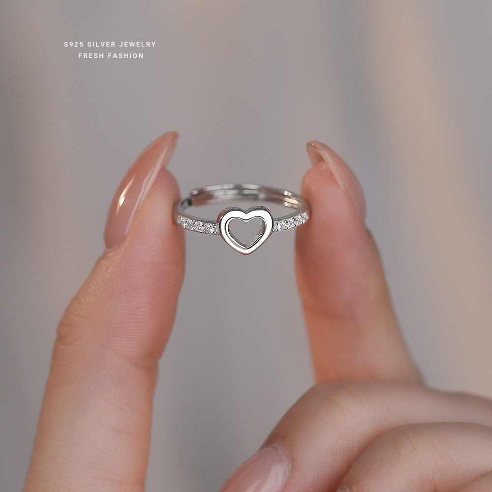 原创S925纯银排钻镂空爱心戒指女韩系ins时尚清新甜美开口食指戒