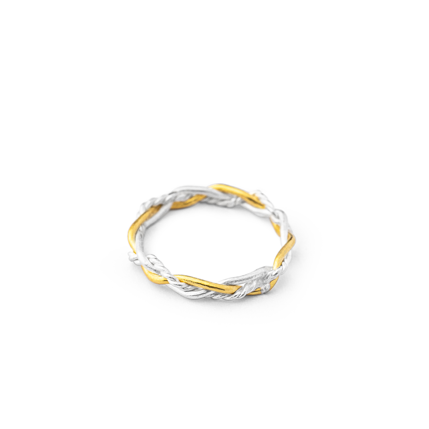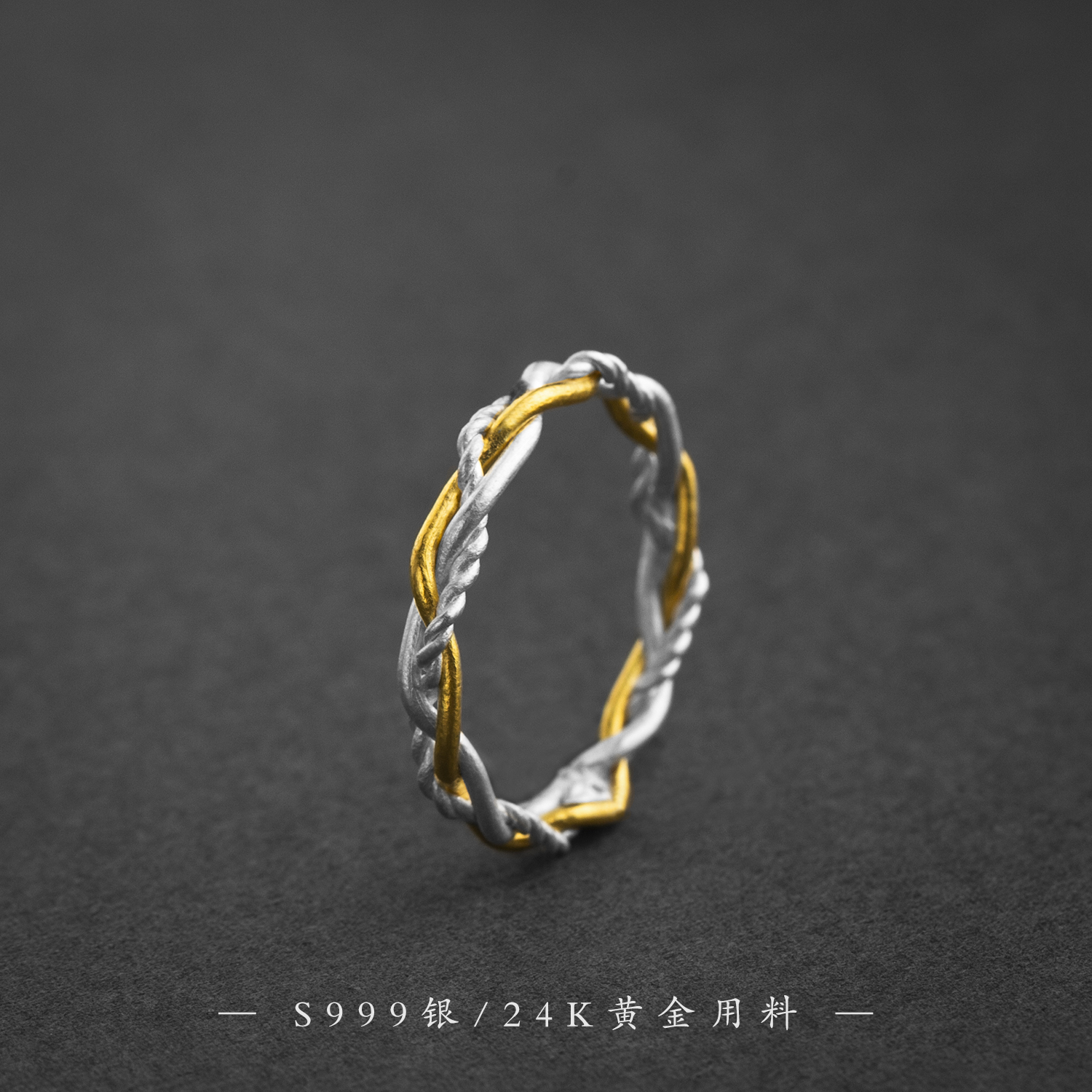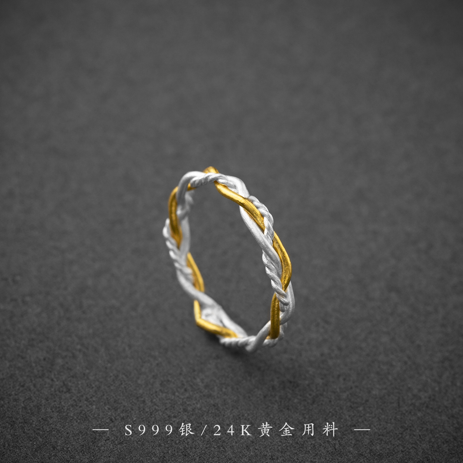 新款金银错手工编织女戒闭口小拇指尾戒轻奢时尚纯银麻花戒指