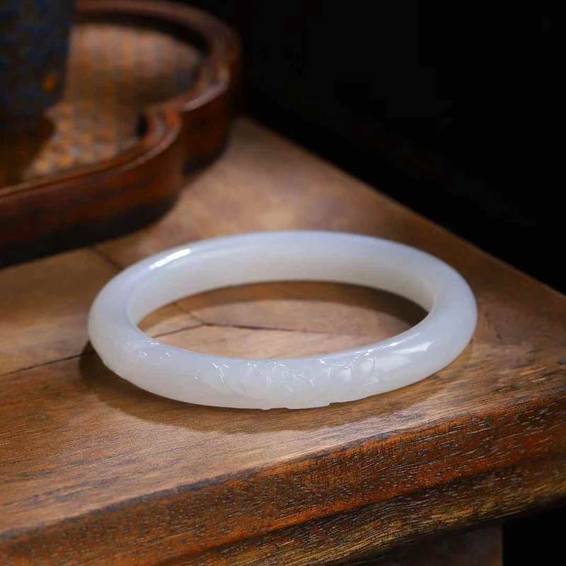 和田玉工厂店天然新疆和田玉青海料老料淡淡烟紫色玉石莲花镯带证