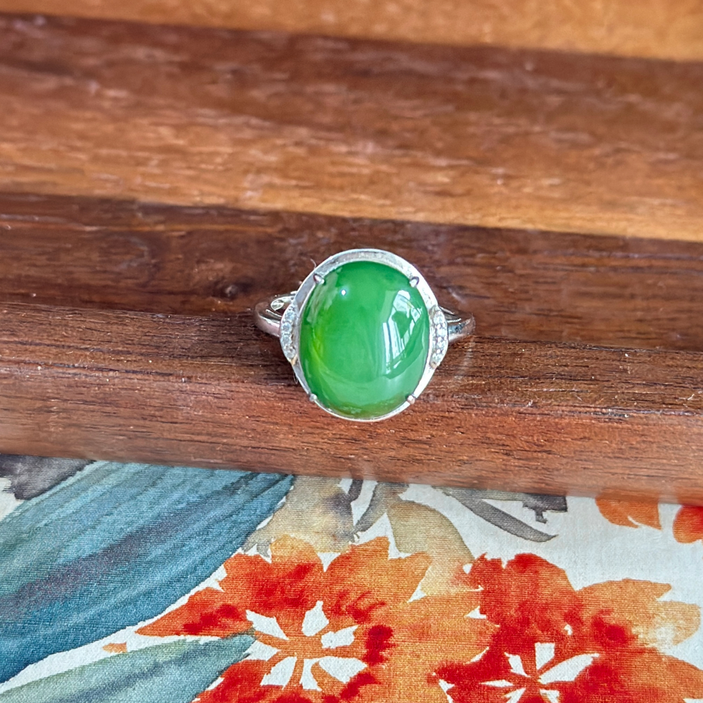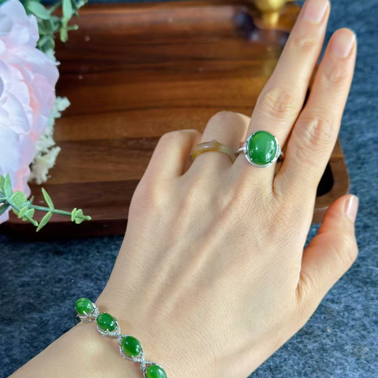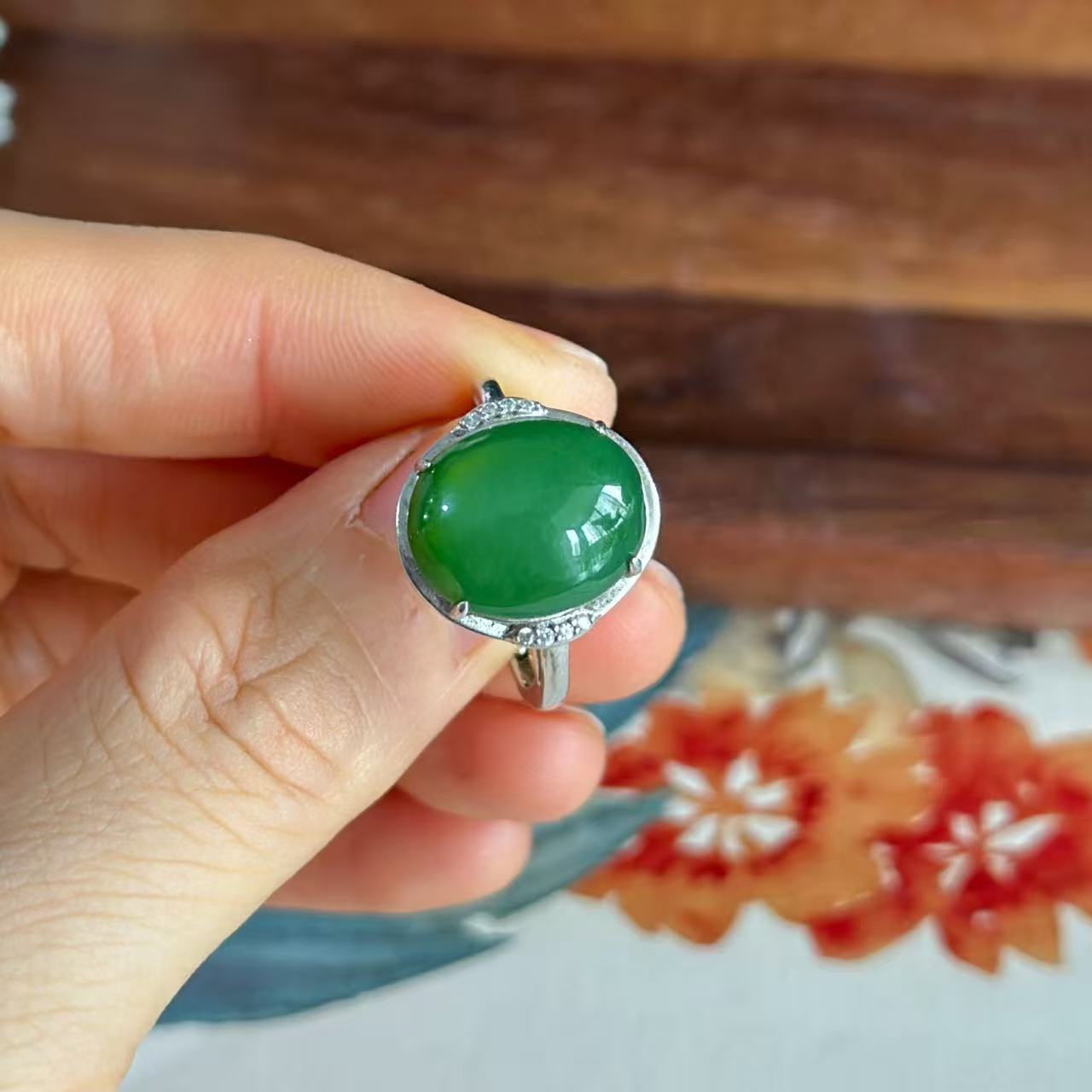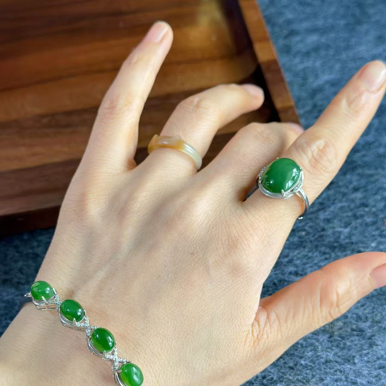 精品天然和田玉俄料碧玉蛋面猫眼戒指S925银镶嵌款活口可调节戒圈