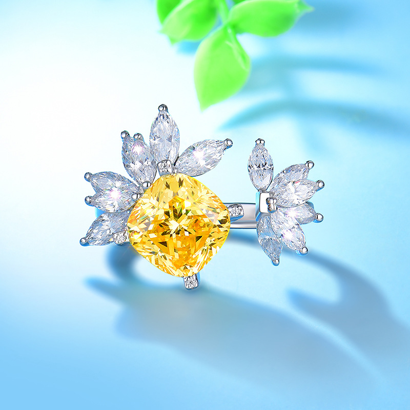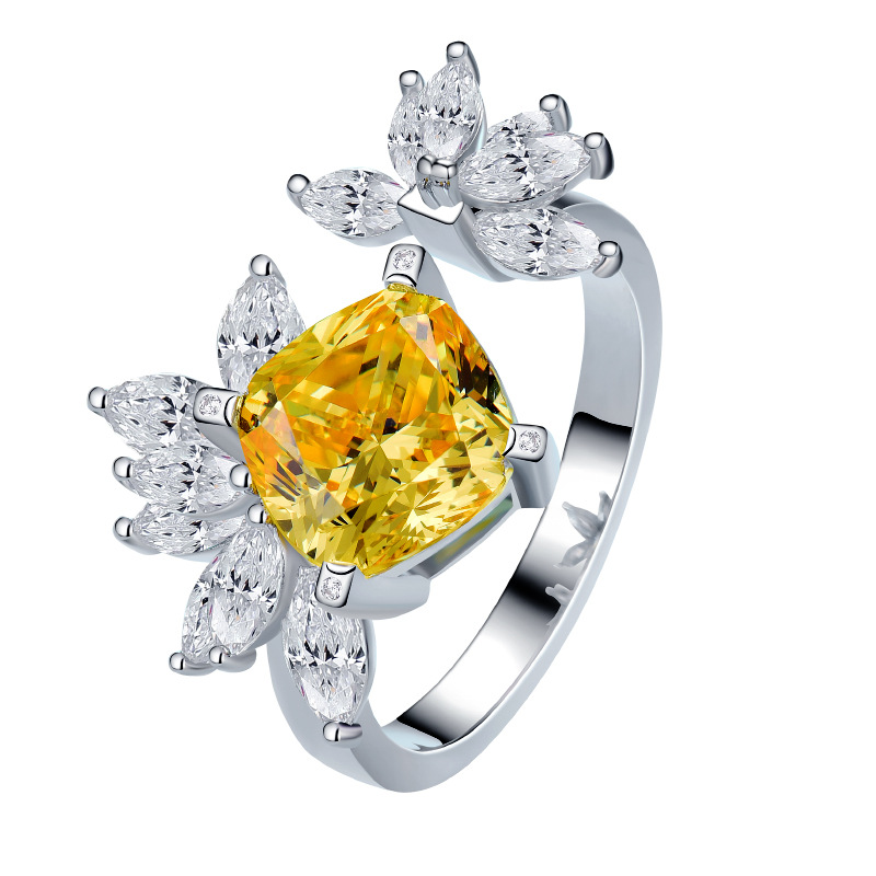 抖音直播枕形仿莫桑石钻戒阿斯切黄钻戒指 镀白金肥正方开口女戒