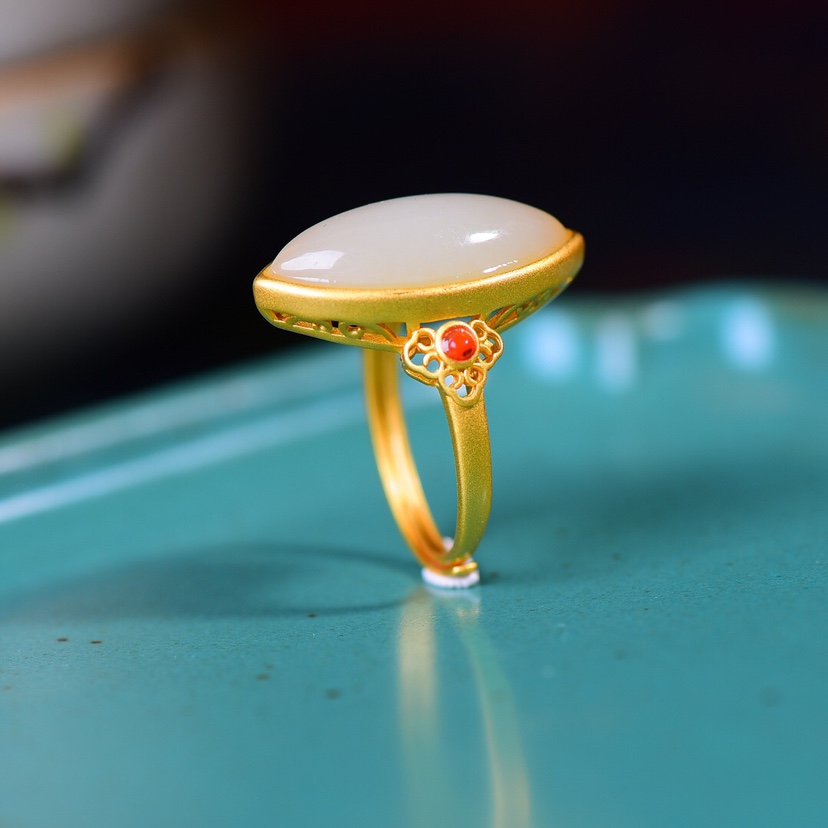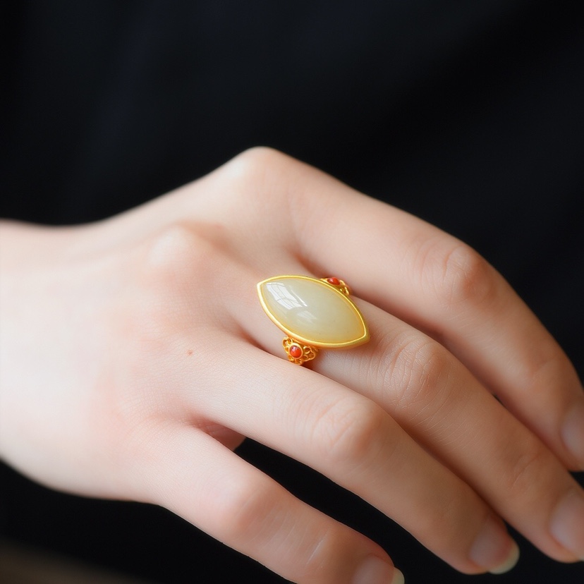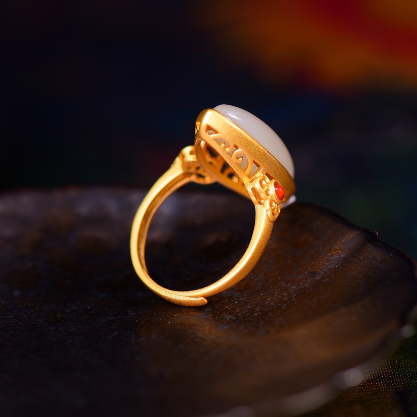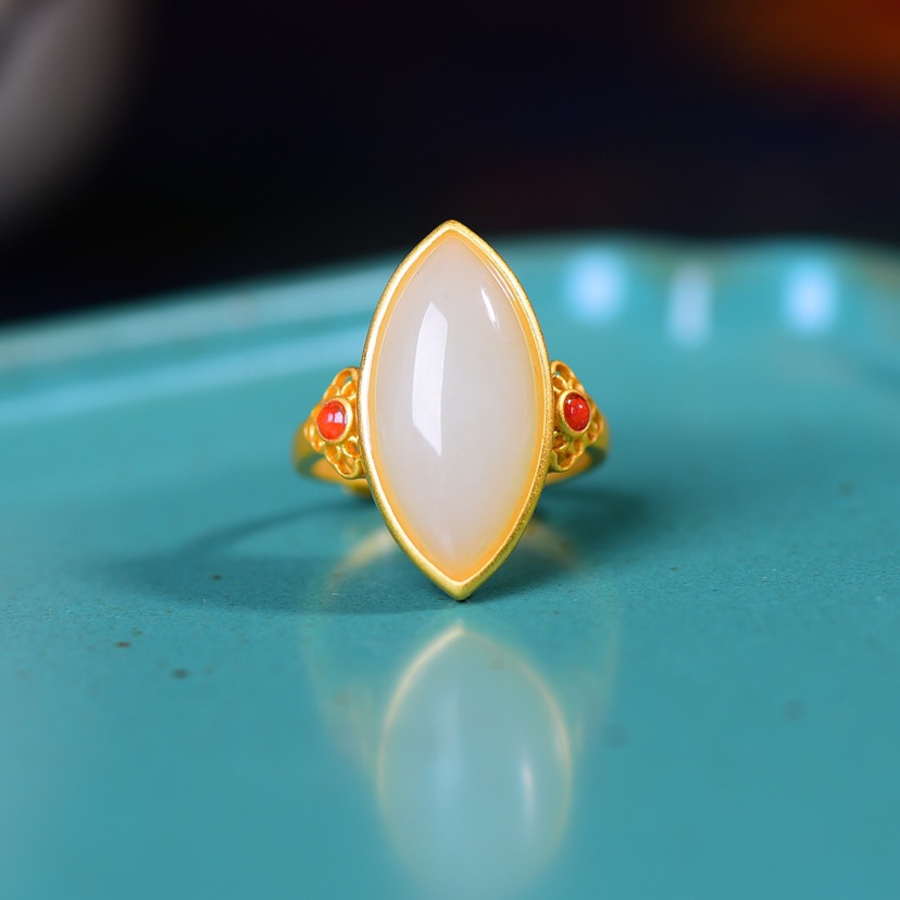 复古S925银镶嵌和田玉白玉马眼形戒指女士复古气质开口指环可调节