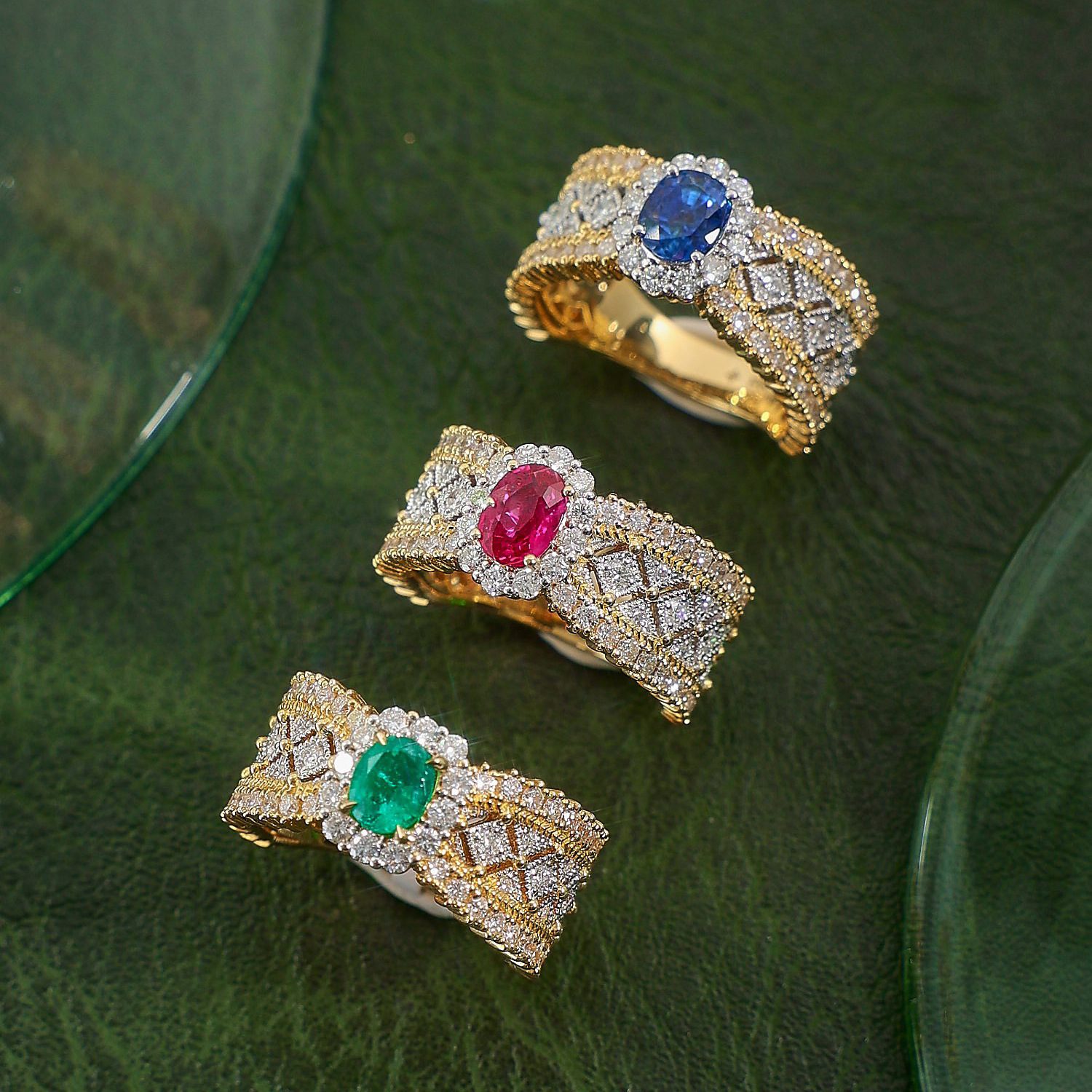 Young织纹雕金蕾丝花边双色金镶钻祖母绿彩宝戒指布拉提专柜同款