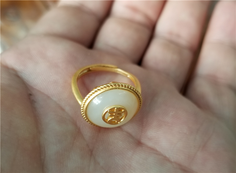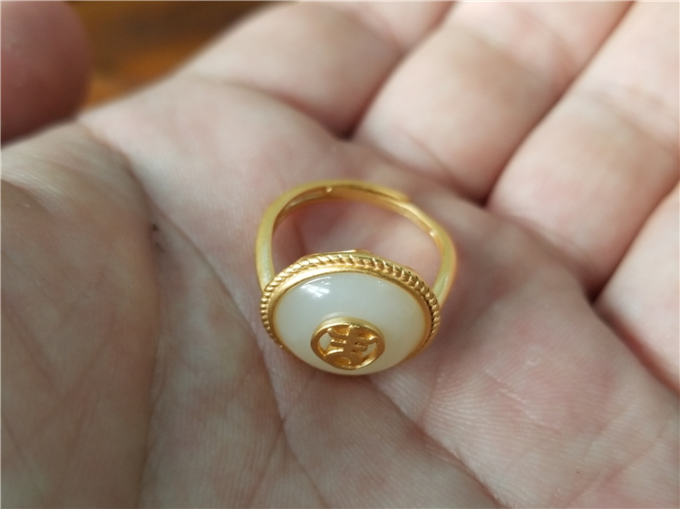 古法黄金工艺平安扣戒指--和田玉白玉羊脂玉镶嵌作品鉴赏期3天