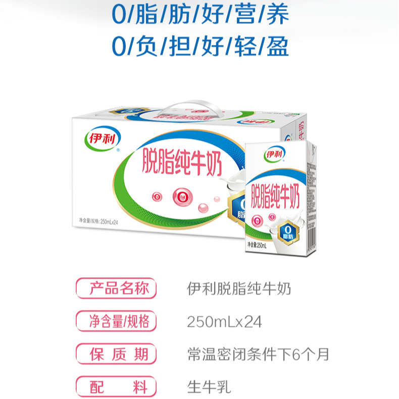 9月新货|伊利脱脂纯牛奶250ml*24盒/16盒零脂肪学生营养早餐