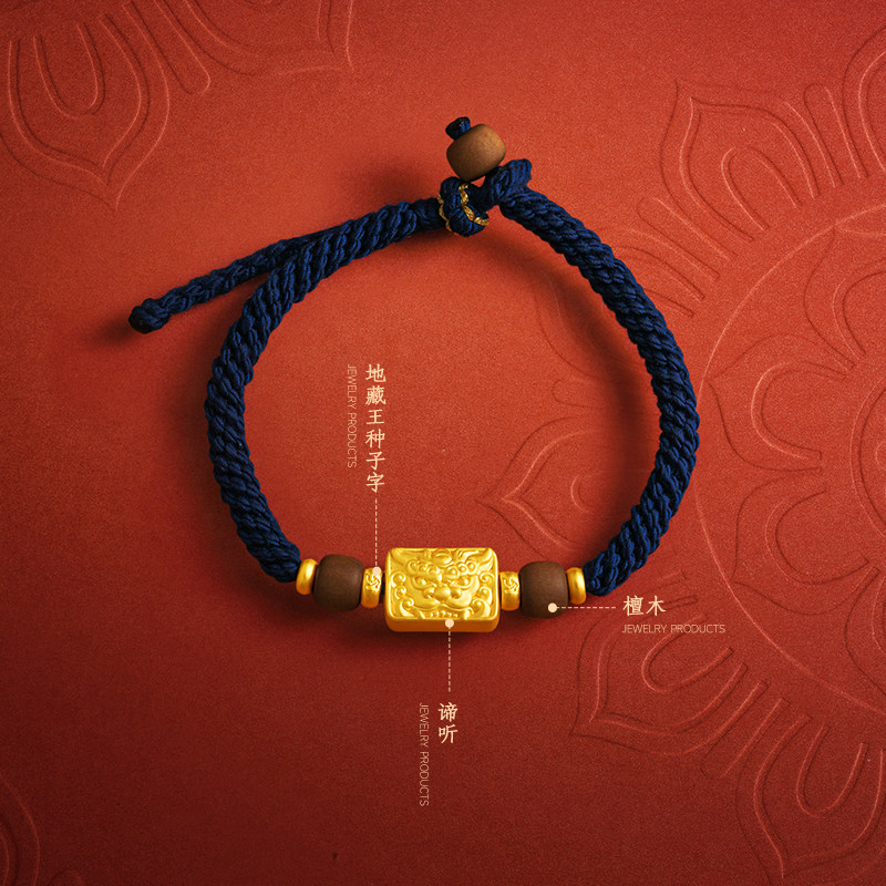 周六福黄金手绳女款5d硬金定价九华山系列禅意谛听藏蓝色编绳礼物