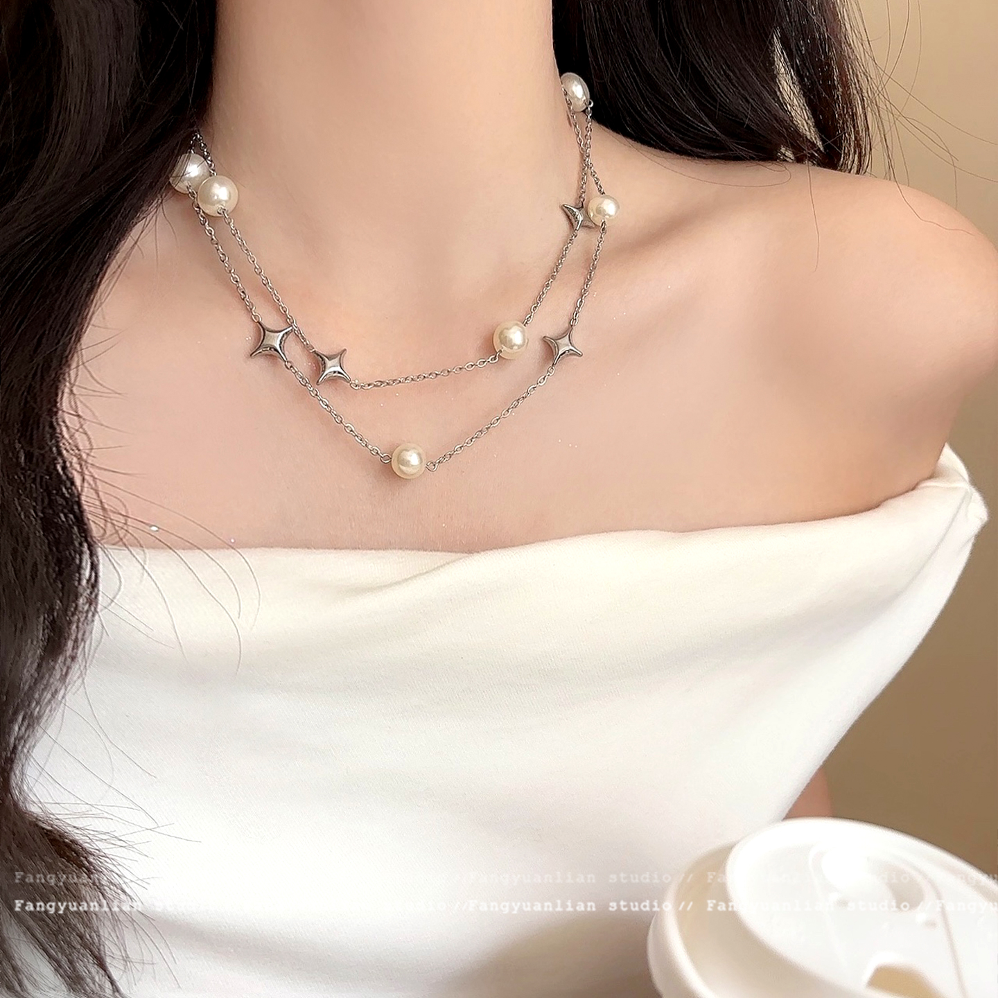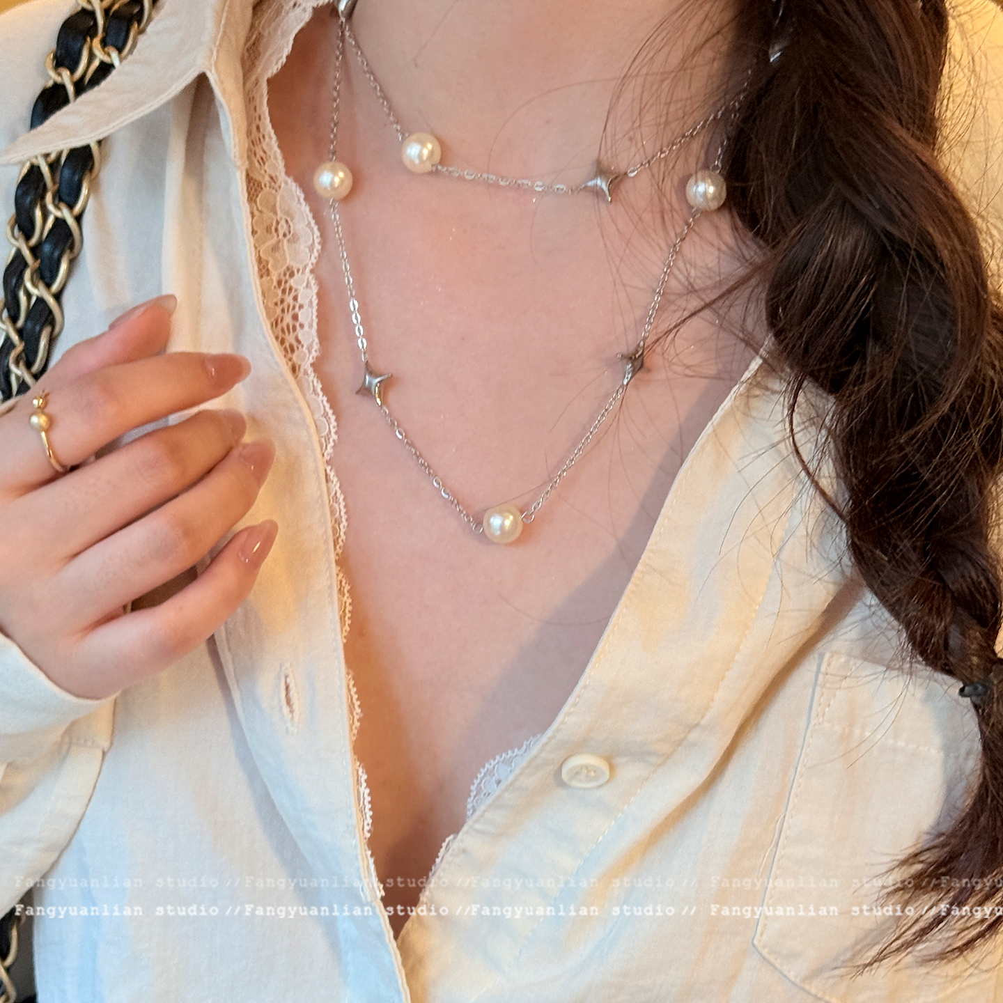 千层涟漪 法式银灰色珍珠项链女夏轻奢小众叠戴锁骨链长款毛衣链