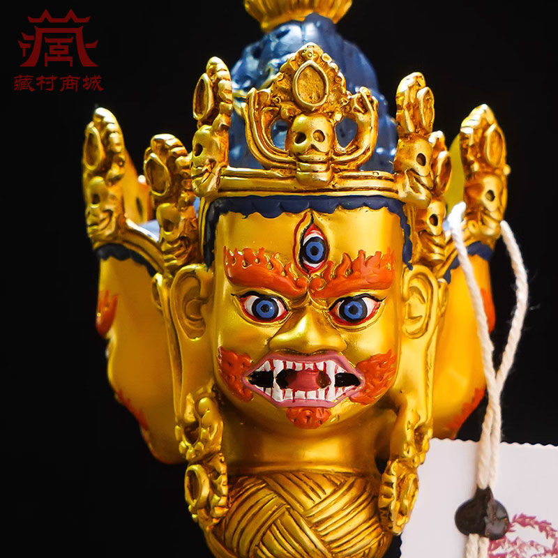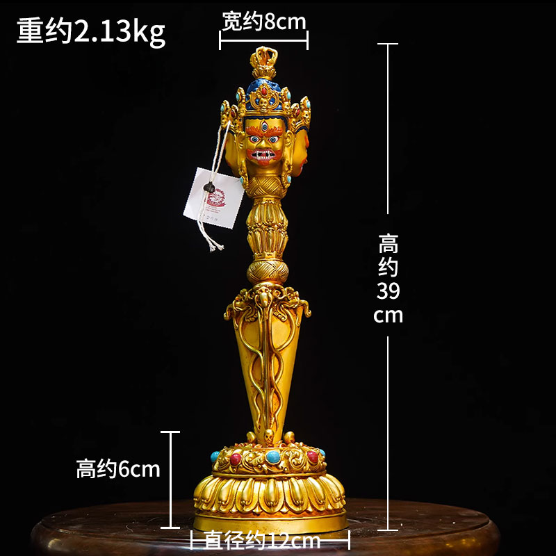 全鎏金三面普巴金刚杵彩绘面部宝石镶嵌金刚橛带底座铜摆件