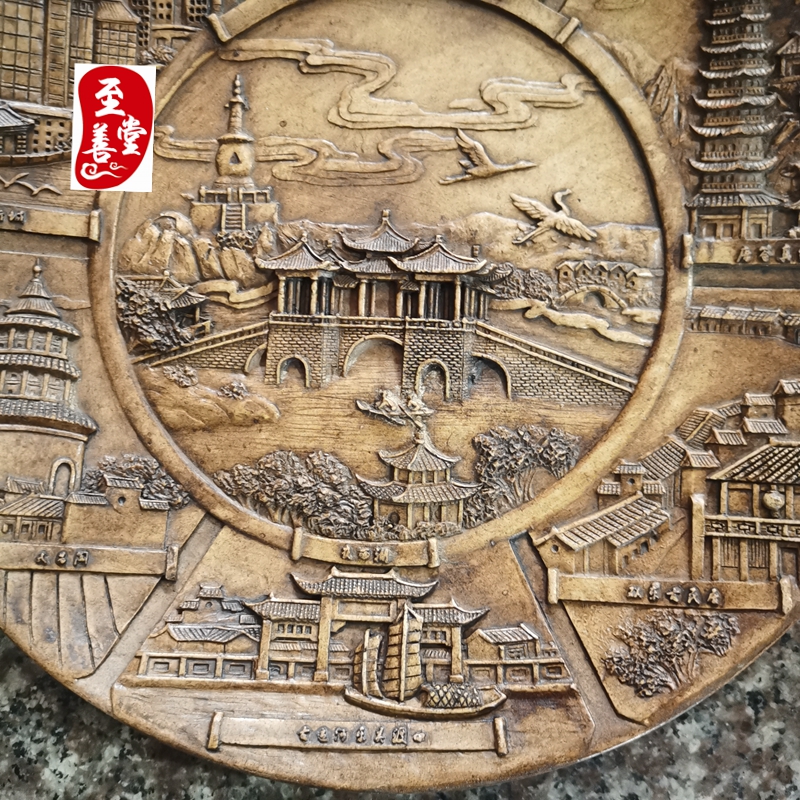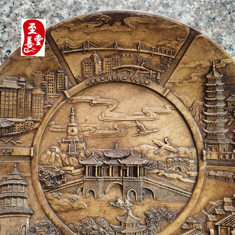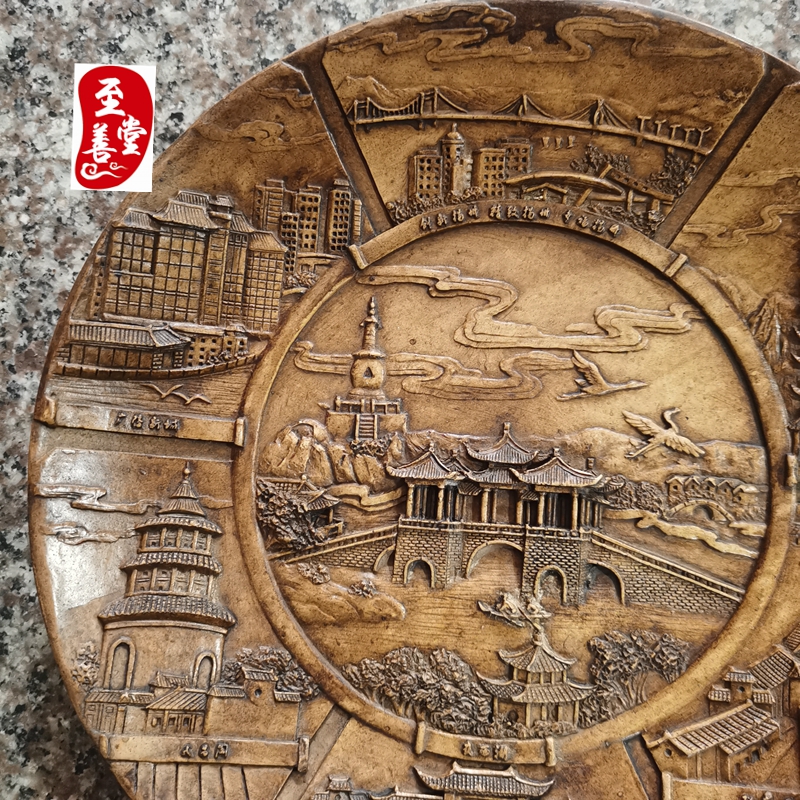 古玩收藏做旧雪花玉北京北海公园山水景色盘子客厅桌面摆件不送支