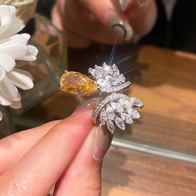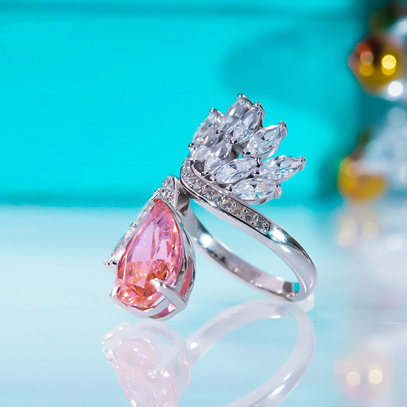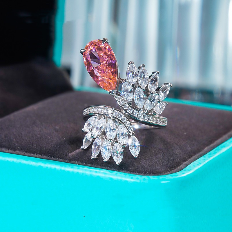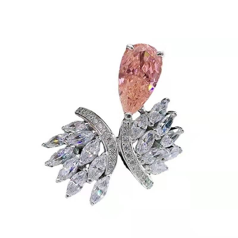 PT950铂金D色莫桑石群镶满钻翅膀粉钻戒指纯银4克拉黄钻甜美精致