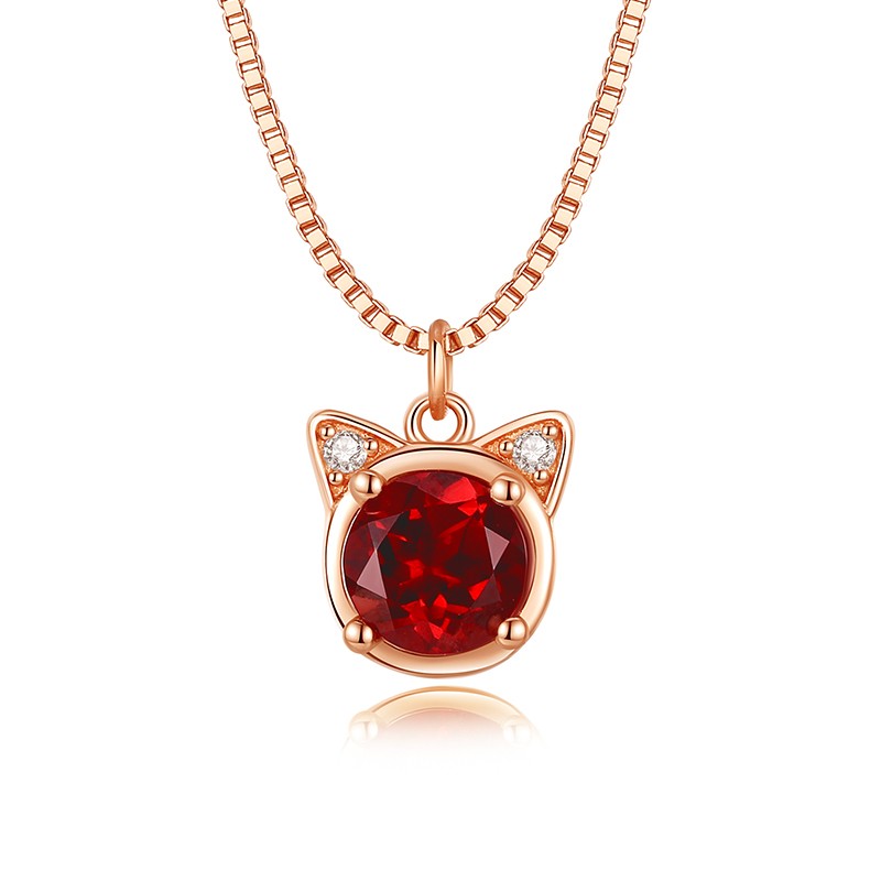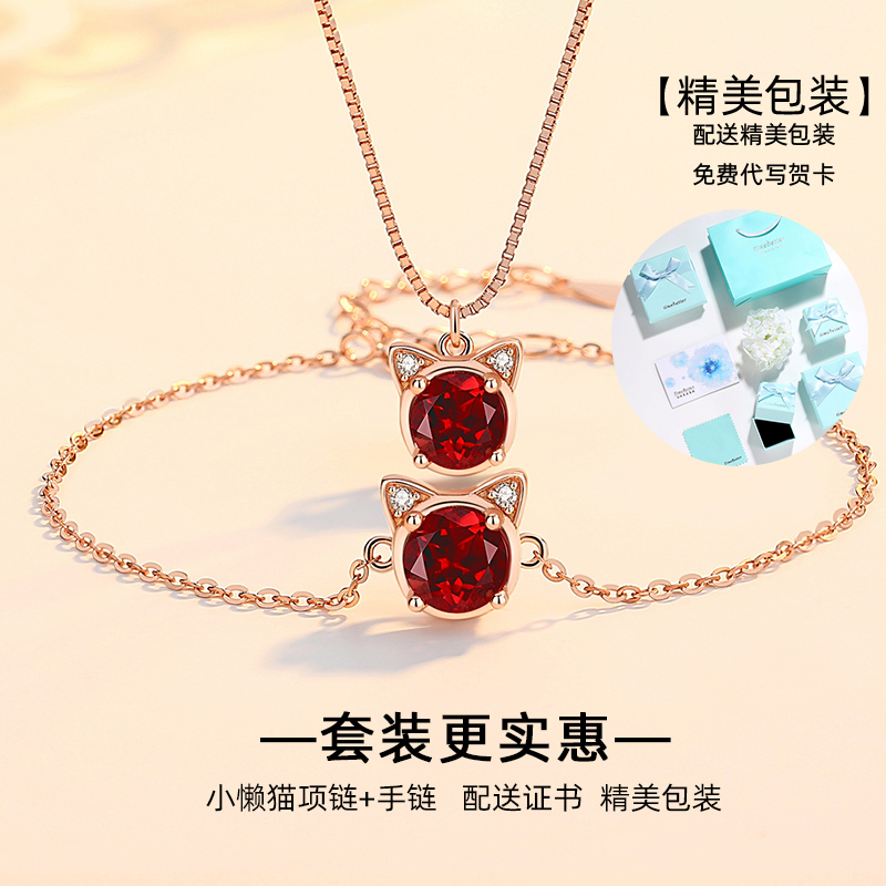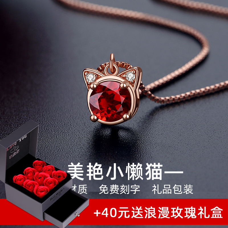 天然石榴石项链女小猫轻奢925银锁骨链可爱猫咪送证书生日礼物