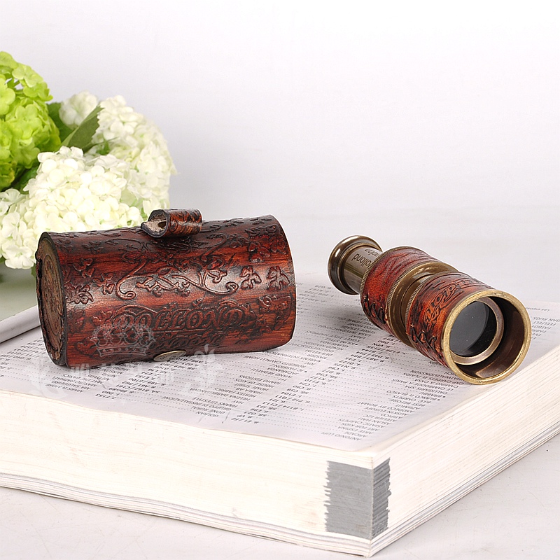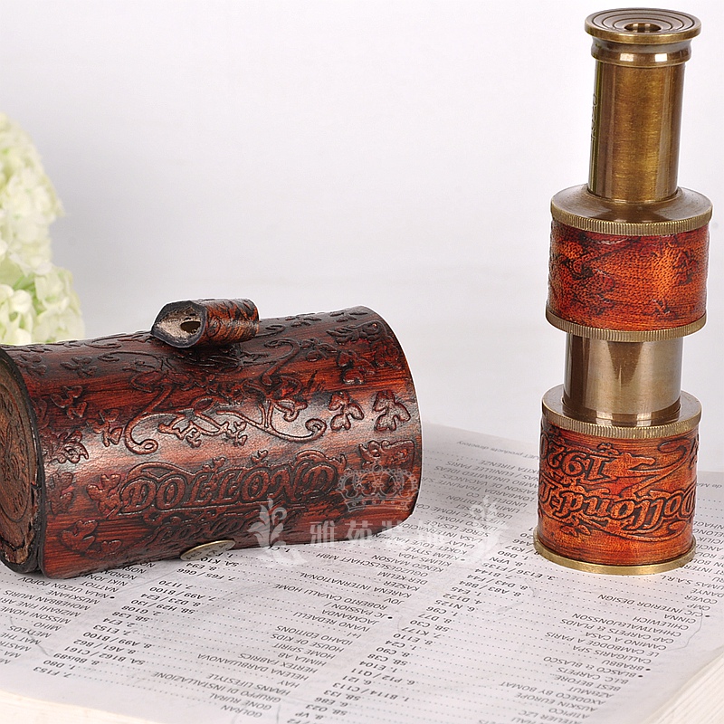 印度黄铜英伦怀旧单筒伸缩式便携望远镜欧式皮盒书房桌面摆件礼品
