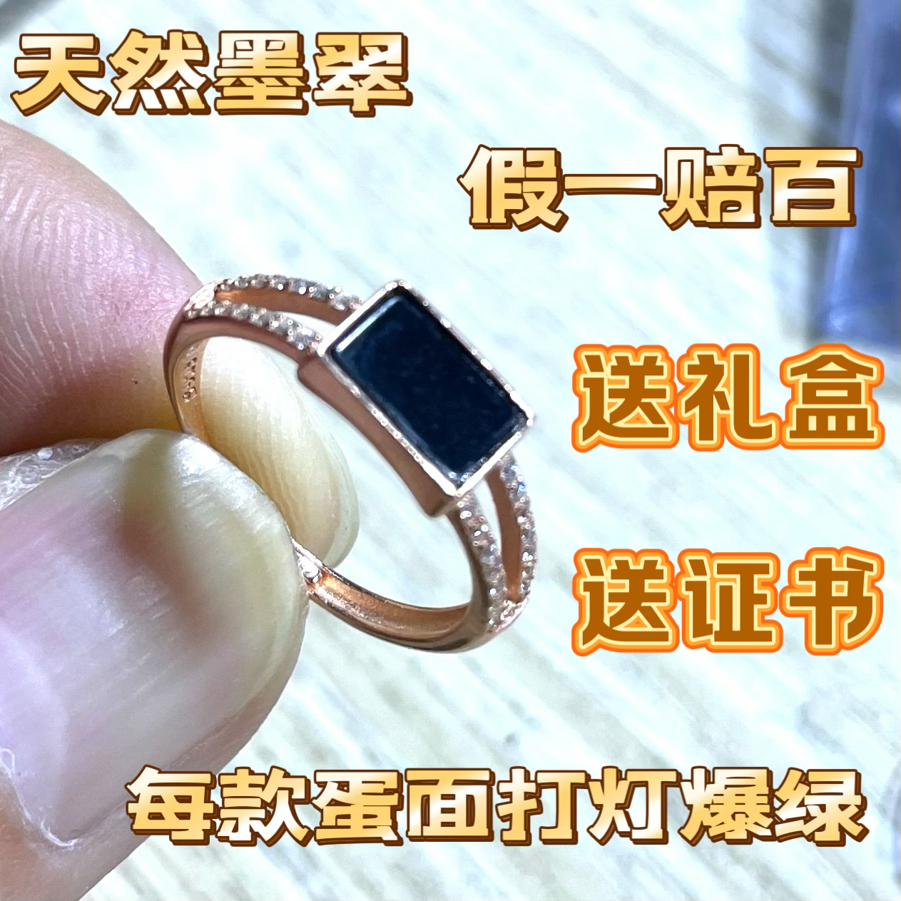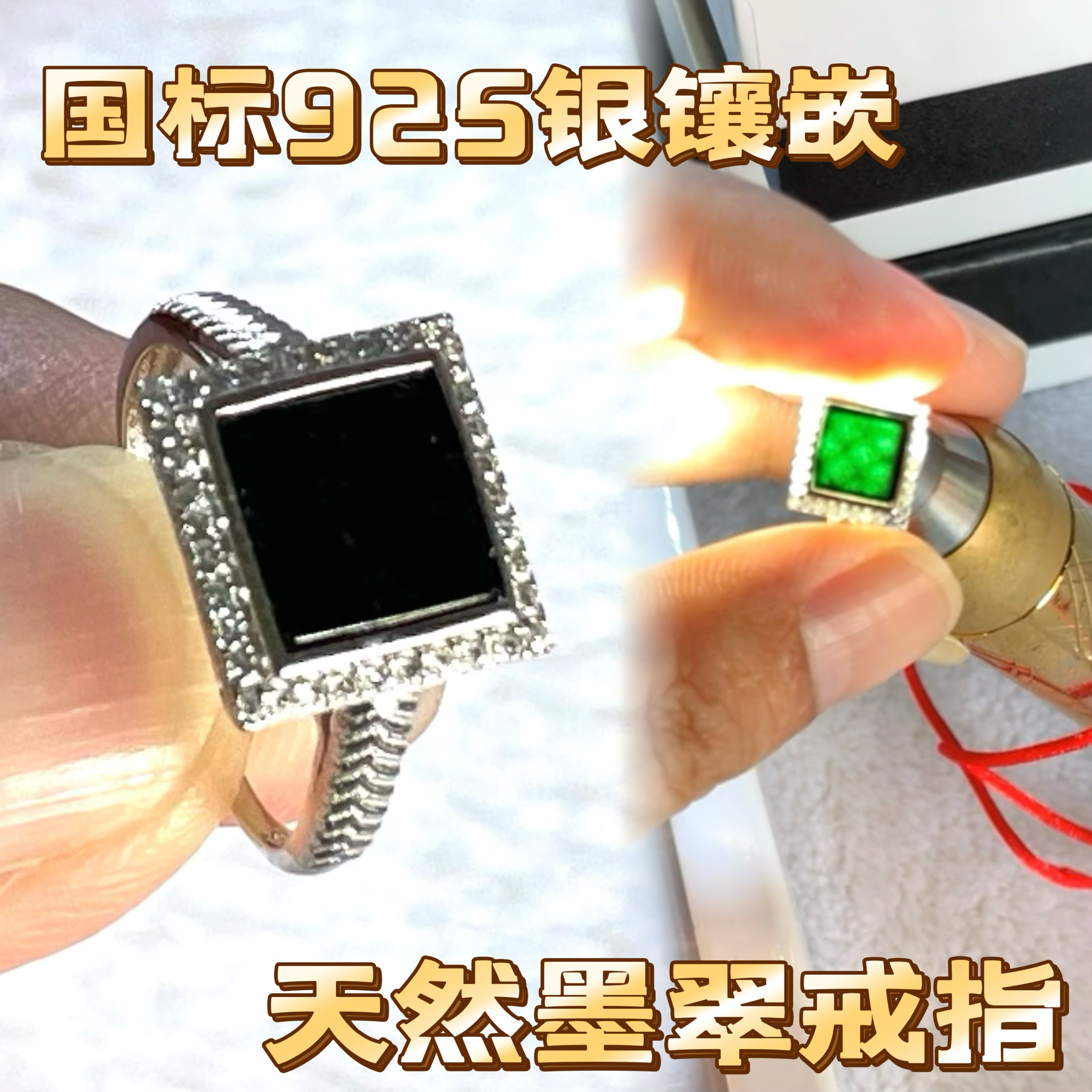 墨翠戒指 天然翡翠A货男女戒指 国标925银镶嵌墨翠戒指打灯爆绿