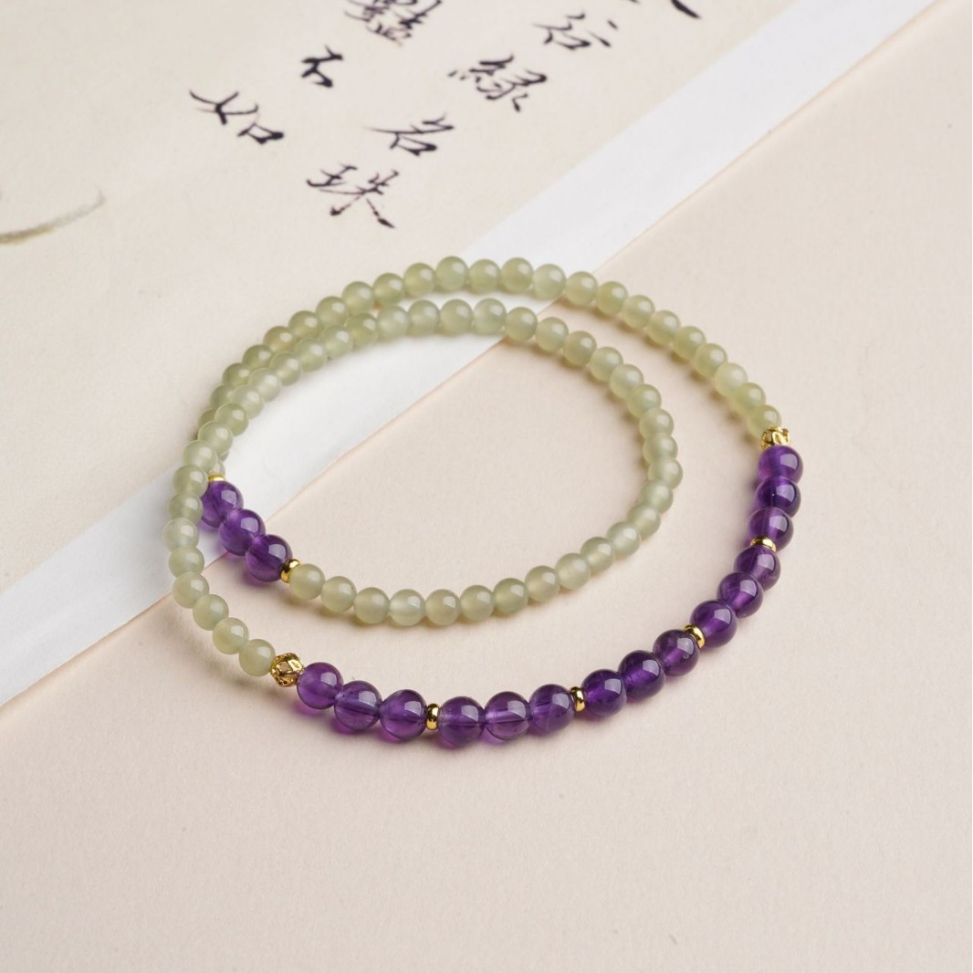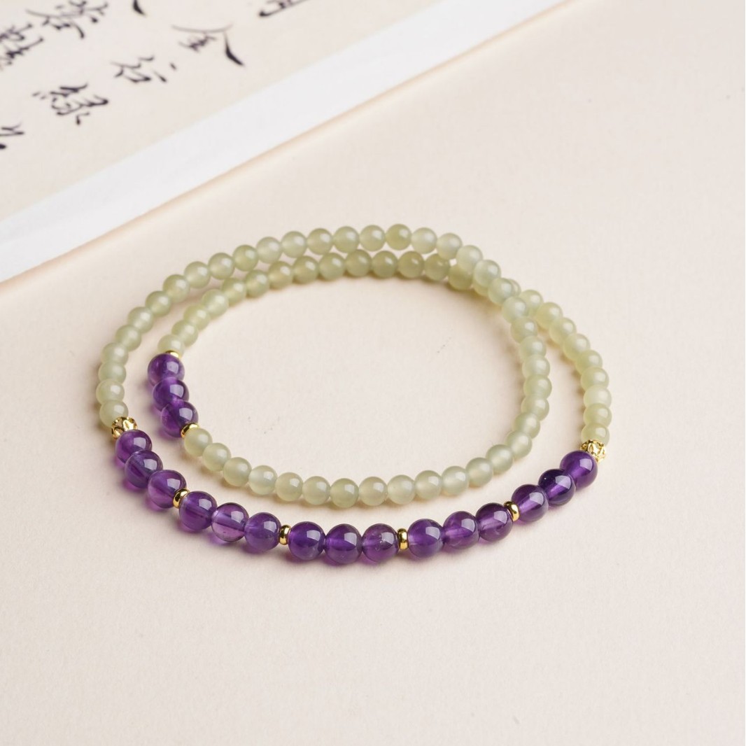 新中式玉石手链轻奢小众精致和田玉手串紫水晶双圈2025年晴水串珠