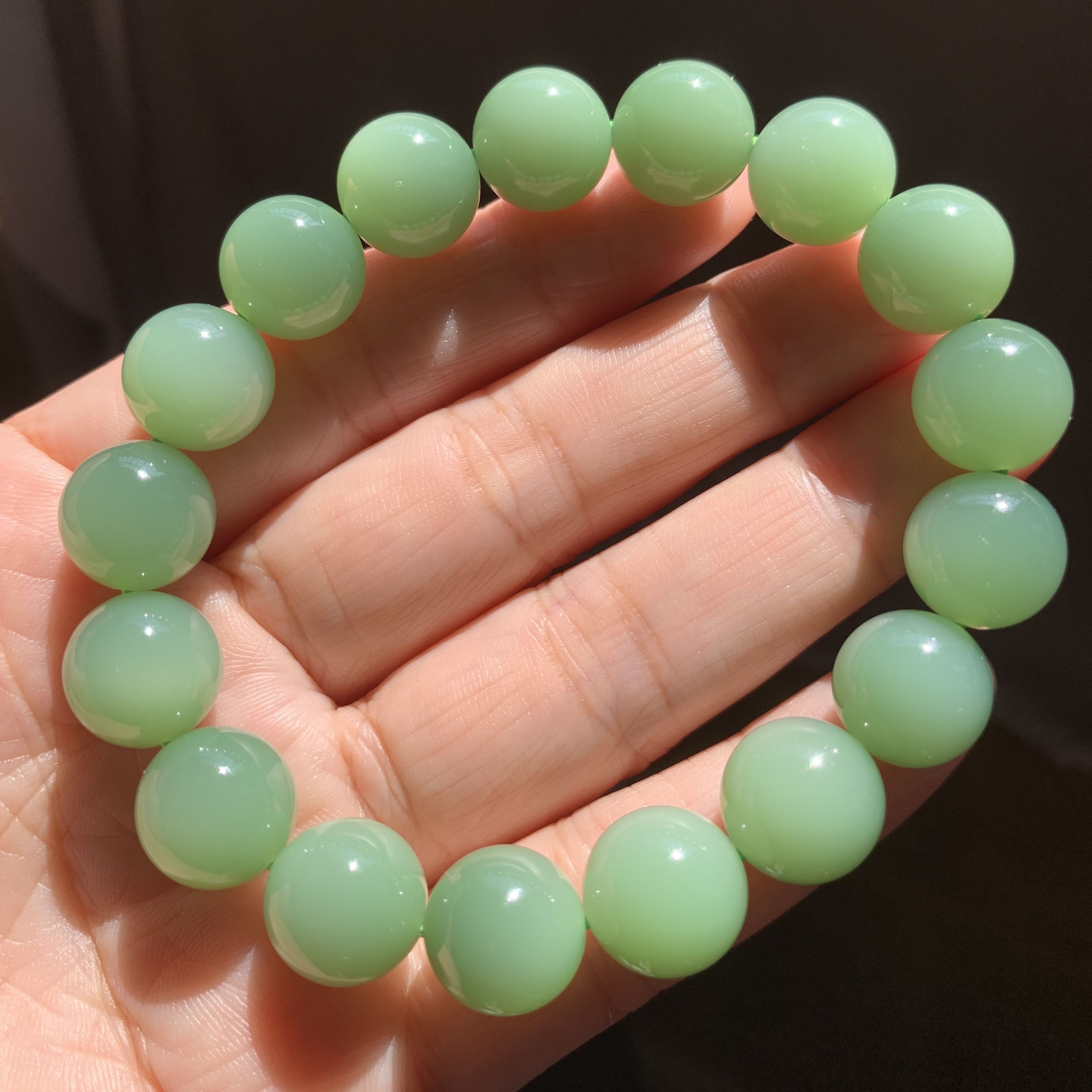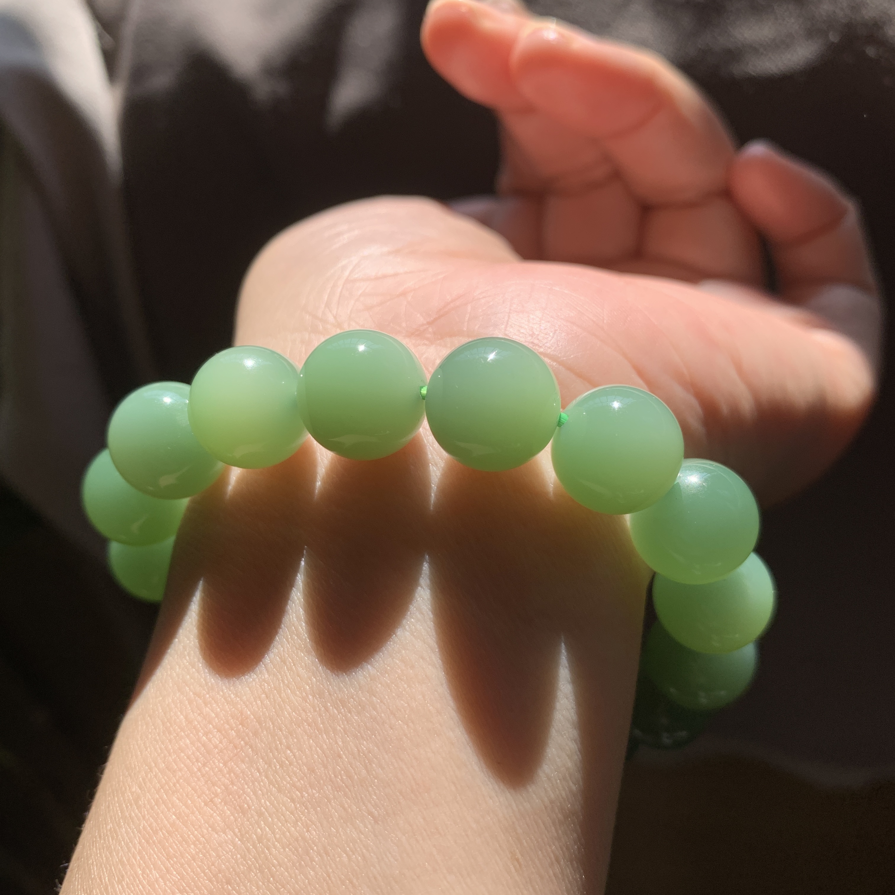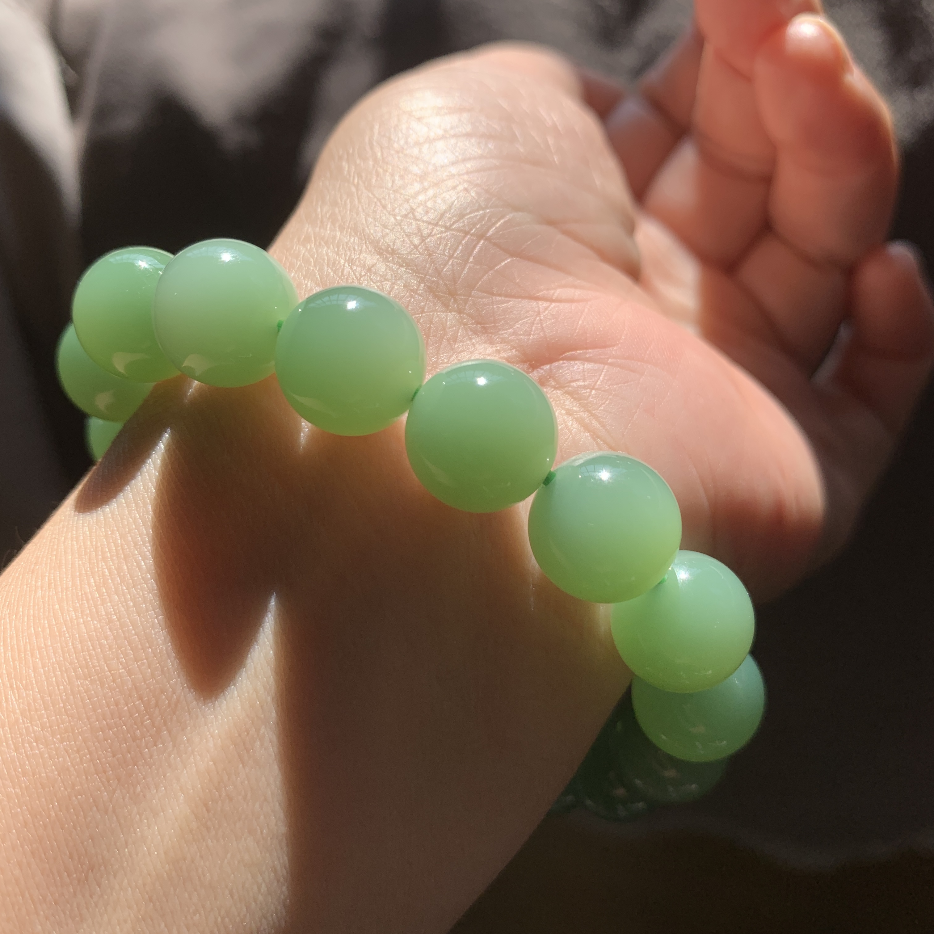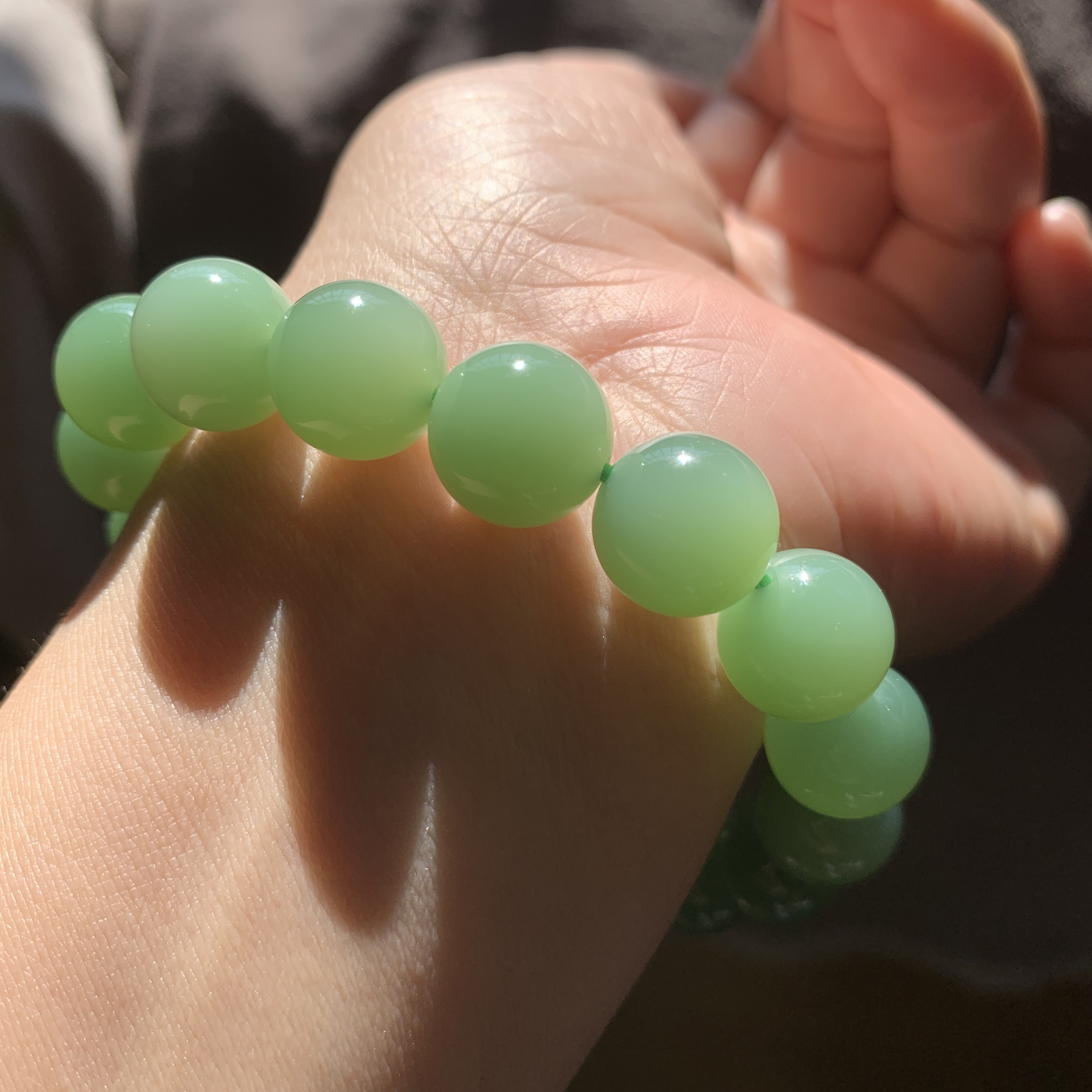 收藏级别和田玉碧玉粉绿瓷绿无结构手链俄罗斯老坑夹层料起荧光12