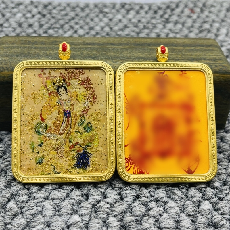 正品双面洒金纯手绘九天玄女贵人唐卡道牌护身符吊坠铜镀金噶乌盒