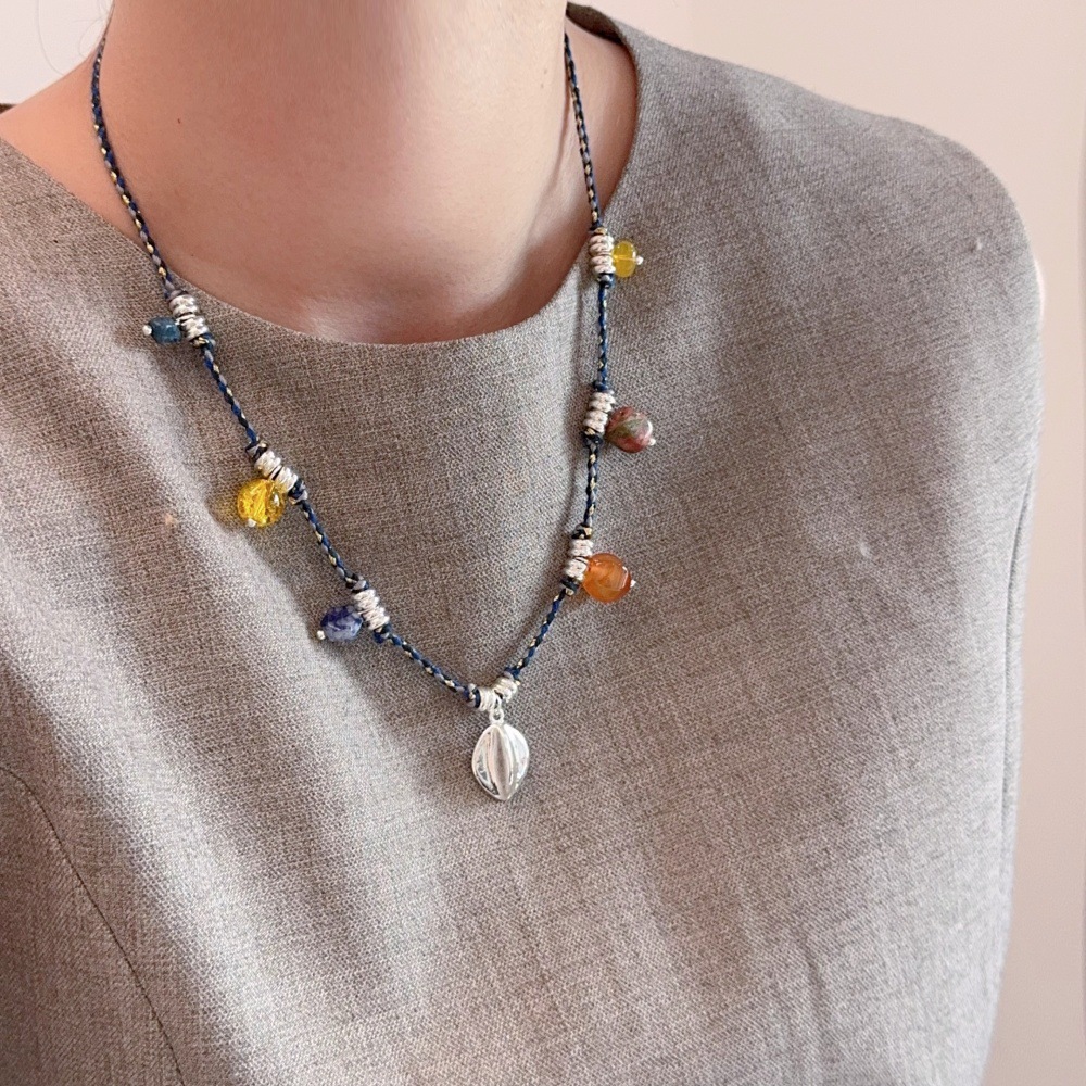 时尚天然石手工编织绳串珠项链女复古度假风锁骨链毛衣链颈链配饰