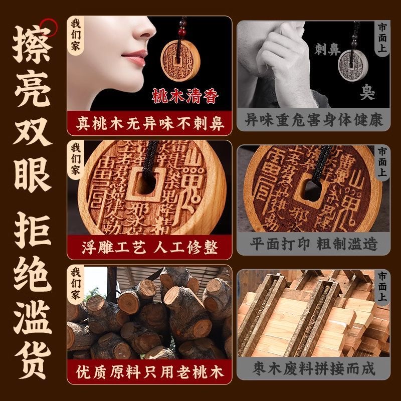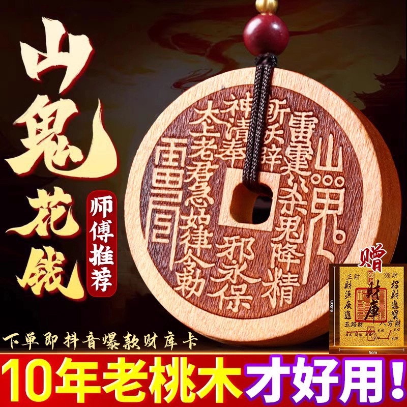 桃木山鬼花钱吊坠钥匙扣挂件八卦木质平安扣项坠男女礼物貔貅佩戴